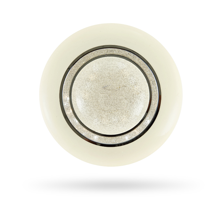 Дизайн. Благодаря прозрачным вкраплением в плафоне и теплым и белым светодиодам обеспечивается эффект мерцания (звездного неба) при включенном светильнике. Кроме того модель отличается наличием прозрачного отверстия в центре светильника, покрытого стразами, во включенном состоянии напоминают мерцание драгоценных камней.