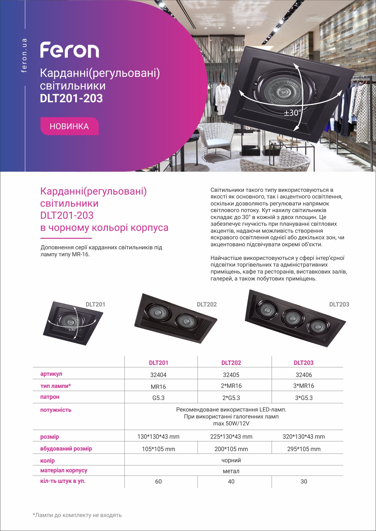 Світильник Feron DLT201 ідеально підходить для використання в житлових, офісних та комерційних інтер'єрах, забезпечуючи якісне освітлення та підкреслюючи стиль вашого простору.