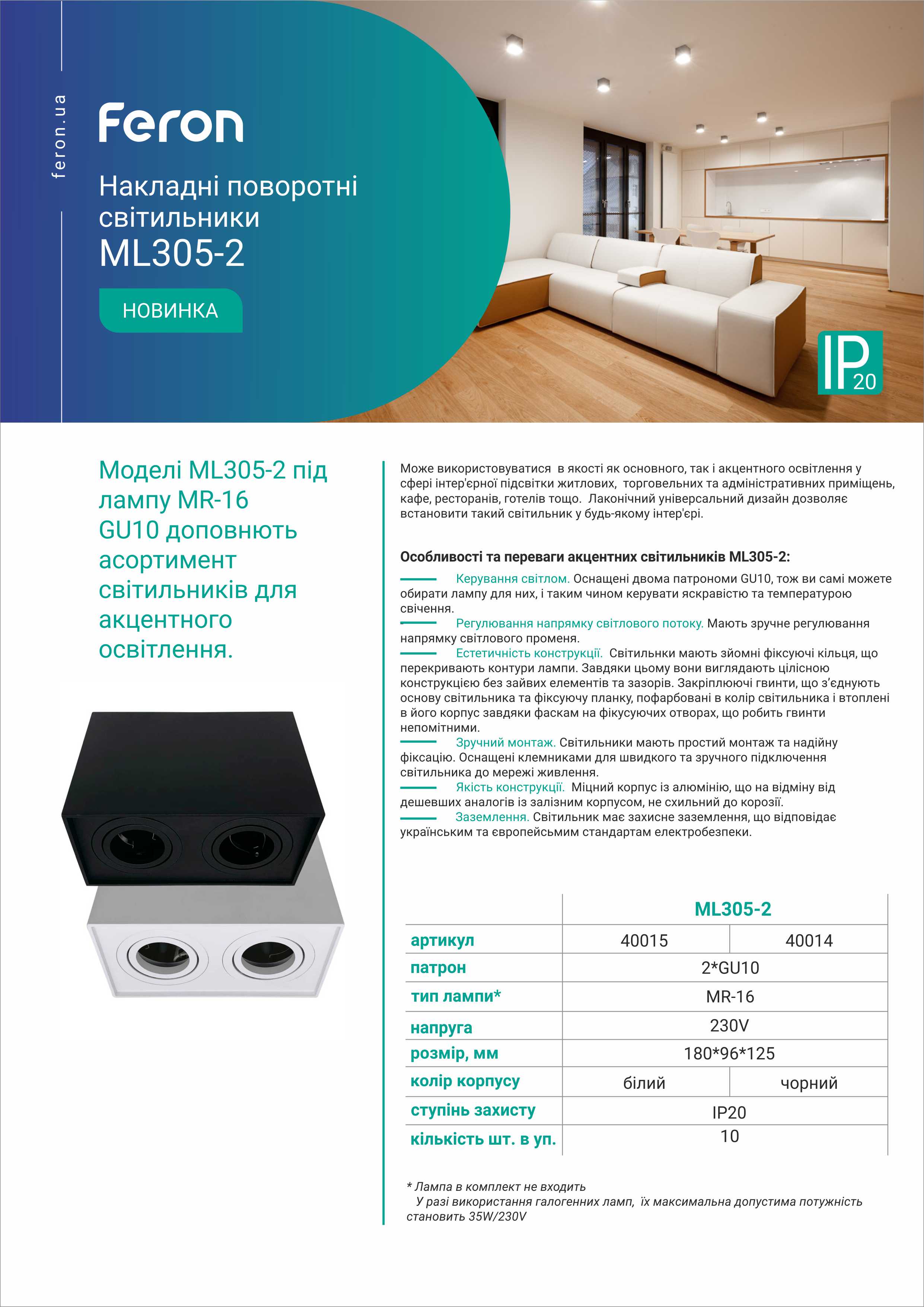 Накладний світильник Feron ML305-2 може використовується в якості як основного, так акцентного освітлення у сфері інтер'єрної підсвітки житлових, торгівельних та адміністративних приміщень, кафе та ресторанів, виставкових залів, галерей та ін.