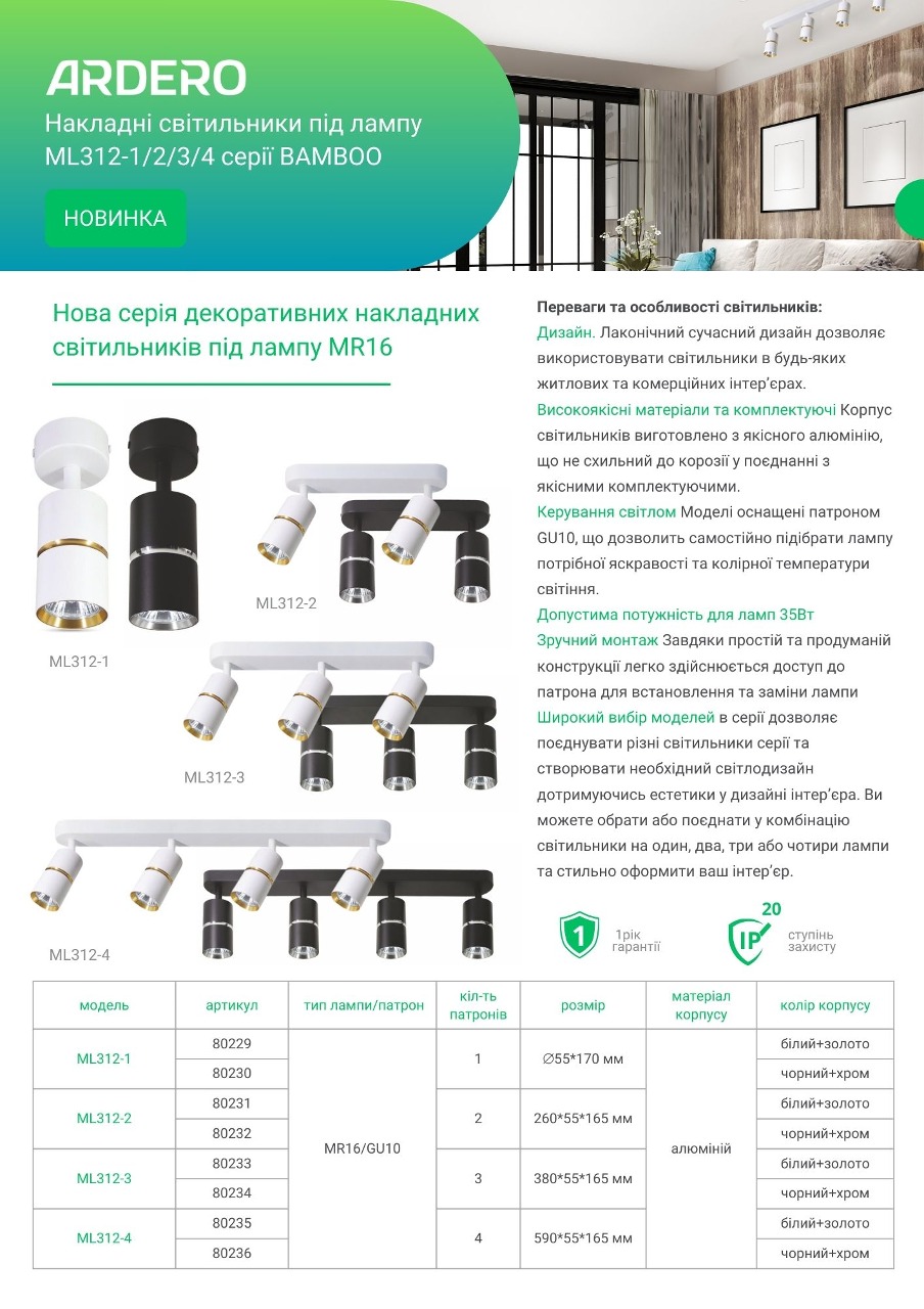 Накладні світильники під лампу Ardero ML312-4 є ідеальним вибором для освітлення будь-яких приміщень, включаючи житлові, комерційні та офісні приміщення. Вони пропонують ефективне та естетичне рішення для створення комфортного освітлення у вашому просторі.