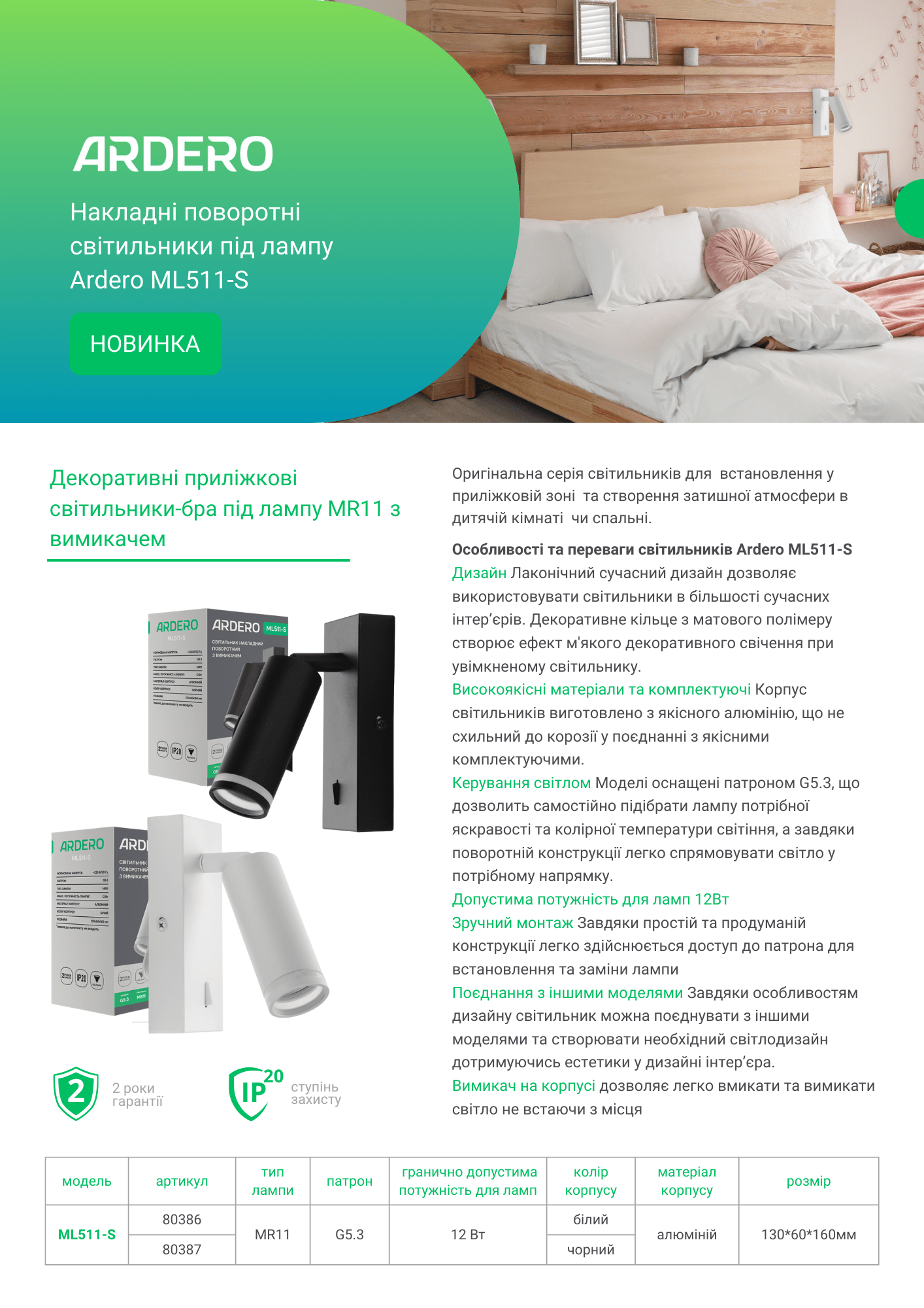 Накладні поворотні світильники під лампу Ardero ML511-S