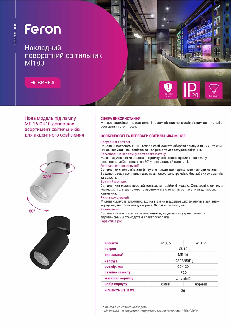 Модель Feron ML180 з лінійки акцентних світильників під лампу з поворотним механізмом.
