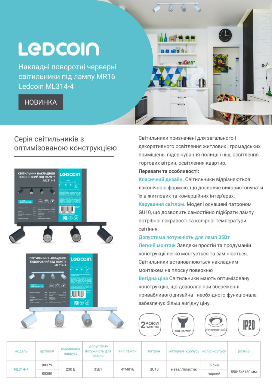 Накладні поворотні світильники під лампу MR16 Ledcoin МL314-4