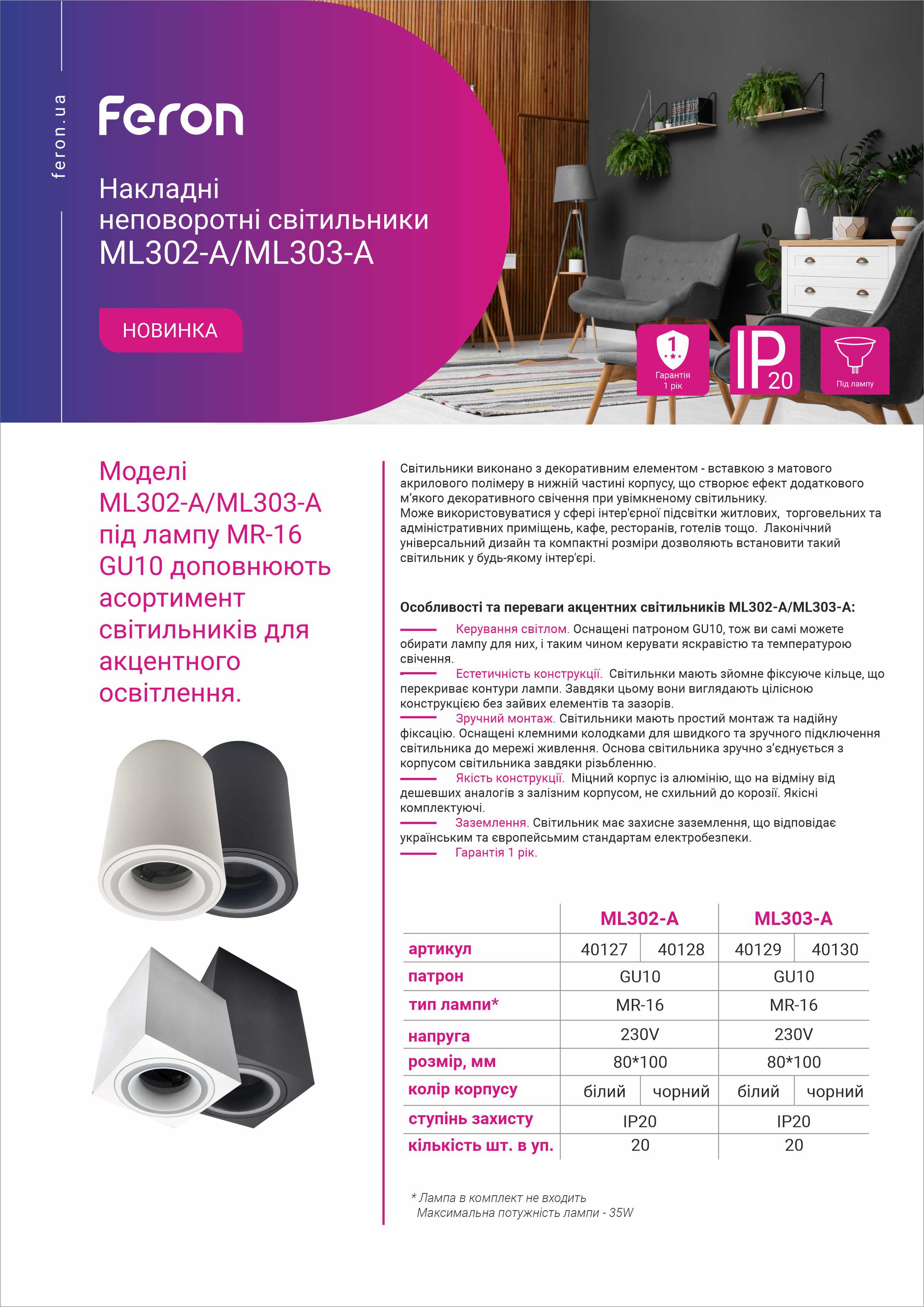 Керування світлом. Світильники оснащені патроном GU10, тож ви самі можете обирати лампу і таким чином керувати яскравістю та температурою свічення.