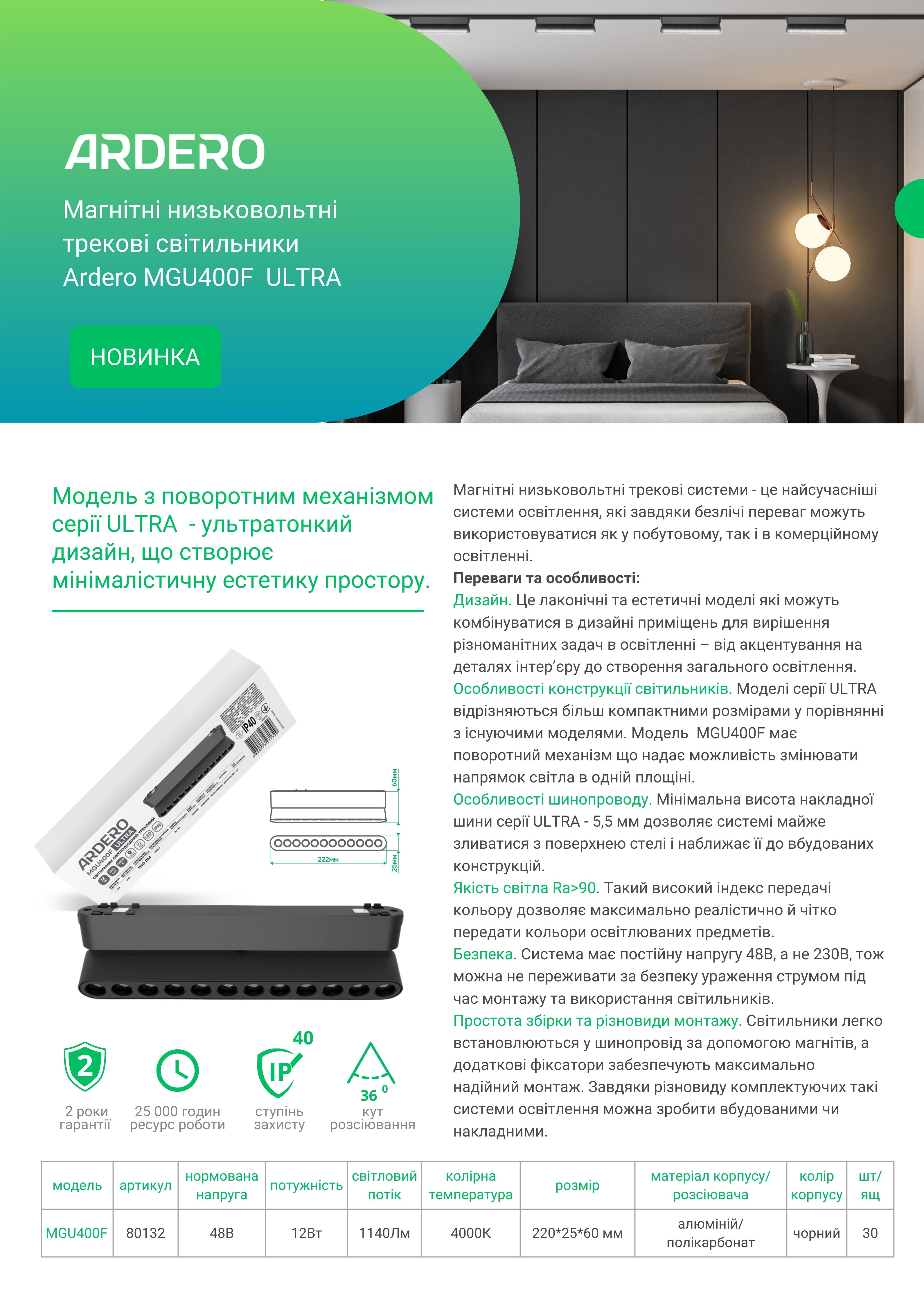 Світлодіодний магнітний трековий світильник Ardero MGU400F ULTRA 12Вт 4000K чорний