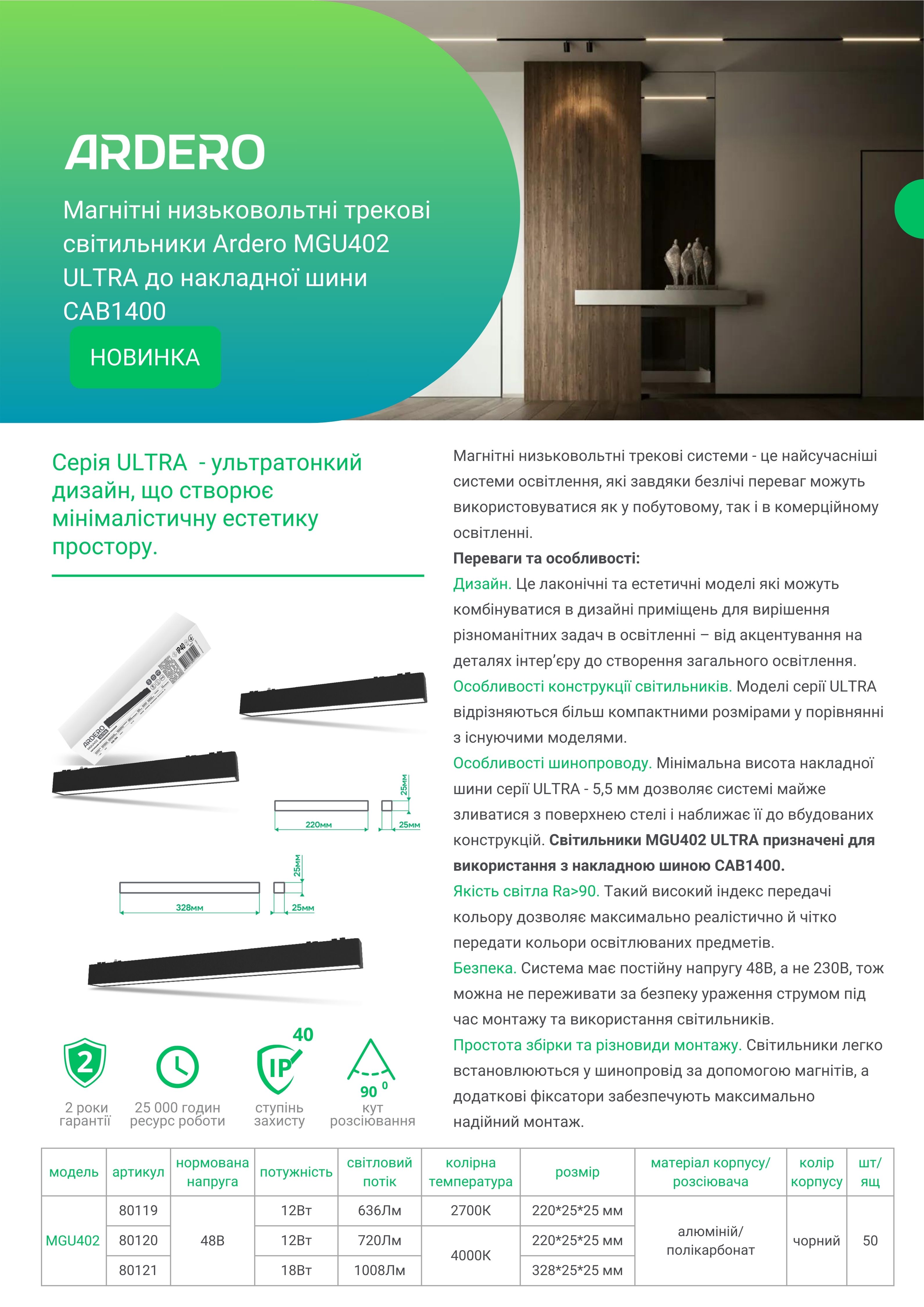 Особливості шинопроводу. Мінімальна висота накладної шини серії ULTRA - 5,5 мм дозволяє системі майже зливатися з поверхнею стелі і наближає її до вбудованих конструкцій. Світильники MGU400 призначені для використання з накладною шиною CAB1400
