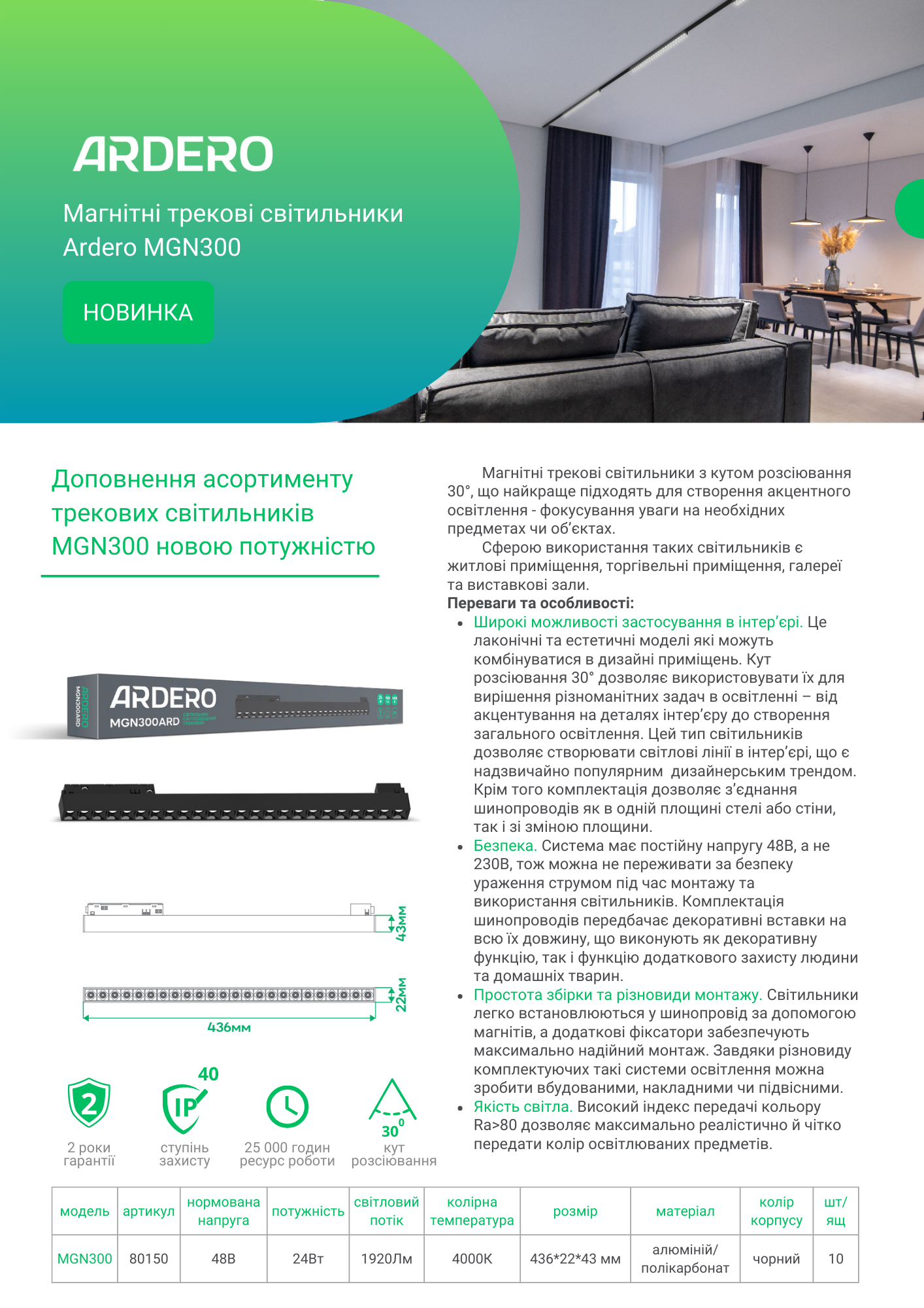 Світлодіодний магнітний трековий світильник Ardero MGN300ARD 24Вт 4000K чорний