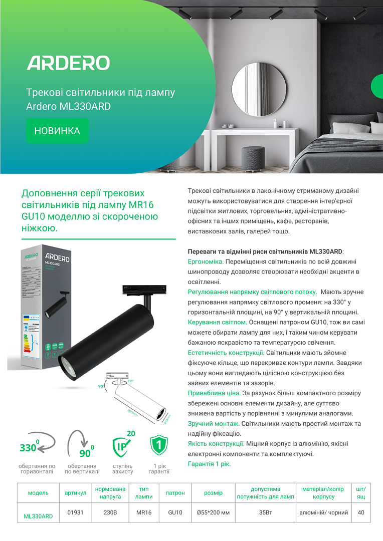 | Тип світильника | трековий |