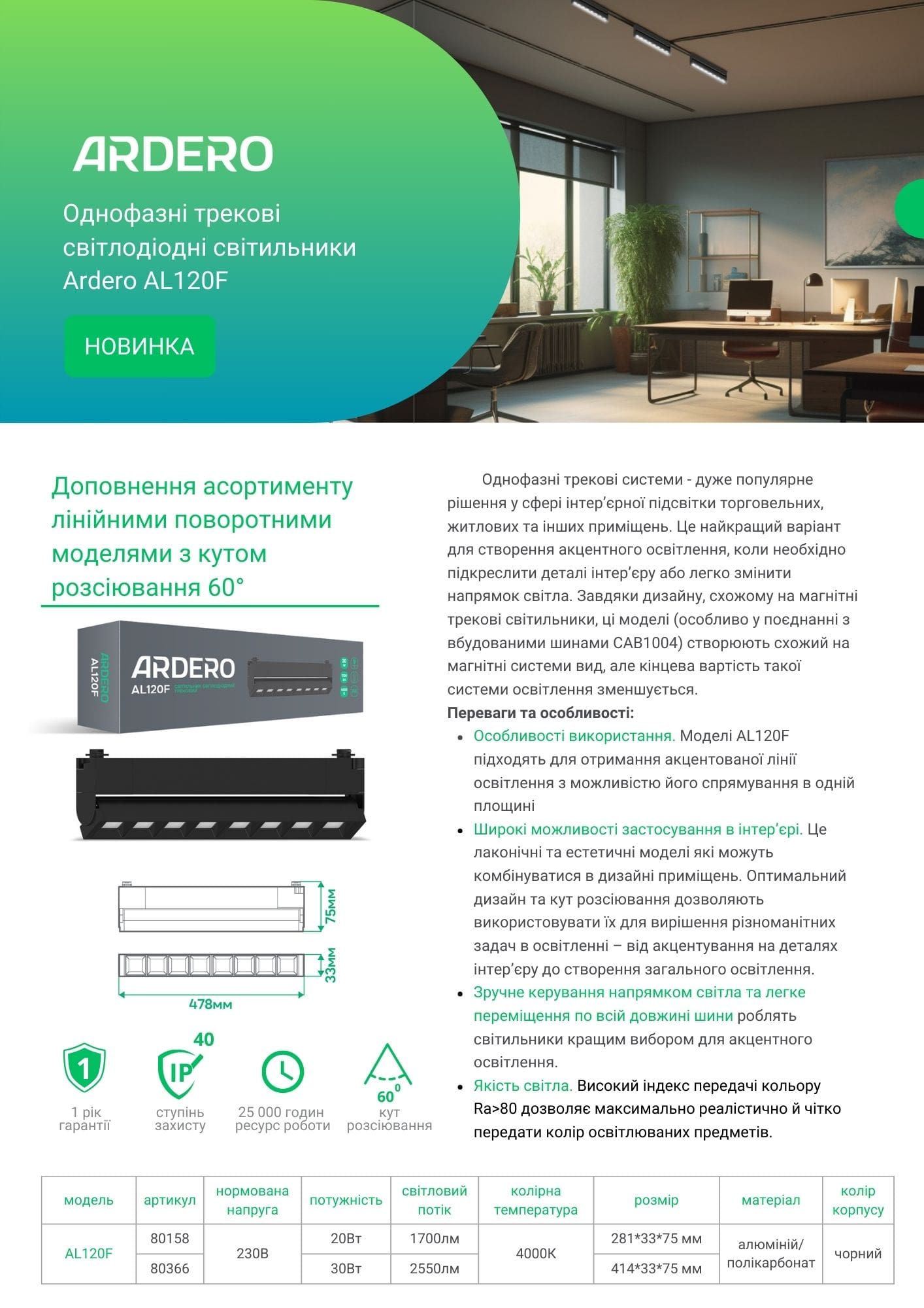 Однофазні трекові світлодіодні світильники Ardero AL120F