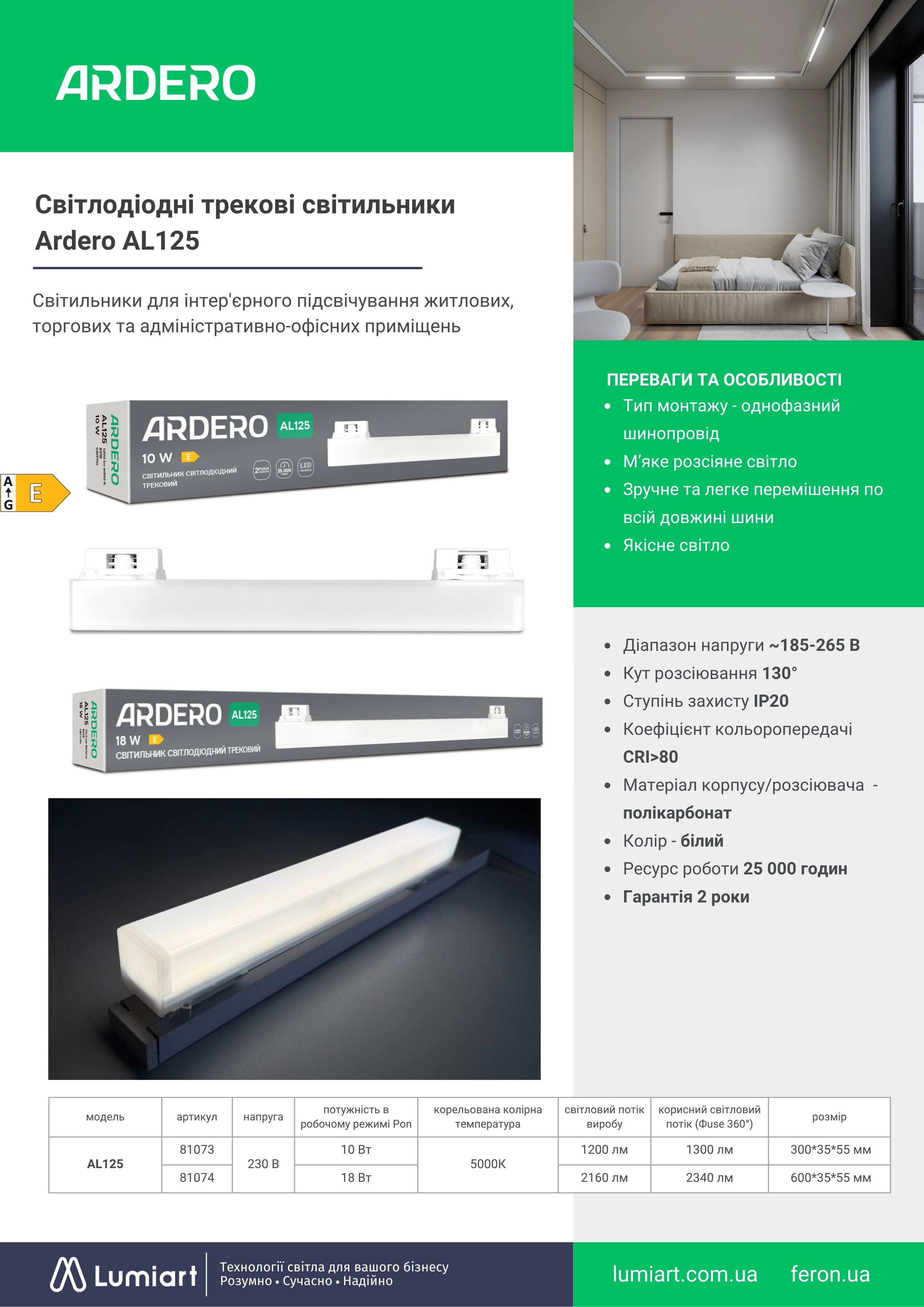 Світлодіодний трековий світильник Ardero AL125 — це ефективне та стильне рішення для організації інтер’єрного освітлення в житлових, комерційних і офісних приміщеннях. Завдяки поєднанню м’якого розсіяного світла, сучасного дизайну та зручного монтажу на однофазний шинопровід, модель ідеально підходить як для основного, так і для акцентного підсвічування.
