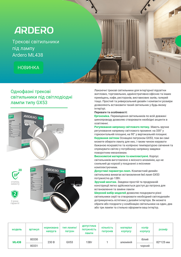 Лаконічні трекові світильники для інтер'єрної підсвітки житлових, торгівельних, адміністративно-офісних та інших приміщень, кафе, ресторанів, виставкових залів, галерей тощо. Простий та універсальний дизайн і компактні розміри дозволяють встановити такий світильник у будь-якому інтер'єрі.
