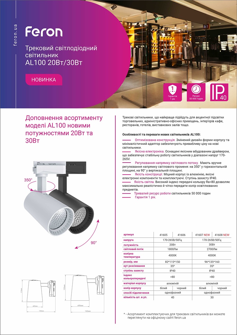 Трекові світильники Feron® мають кут розсіювання 35° та можуть переміщюватись по всій довжині шинопроводу, що дозволяє використовувати їх як для акцентної підсвітки, так і для основного освітлення. У світильників зручно регулювати напрямок світлового променя: на 360° по горизонтальній осі, на 90° по вертикальній осі. Міцний корпус із алюмінію, якісні електронні компоненти та комплектуючі забезпечують тривалий ресурс роботи в 50000 годин.