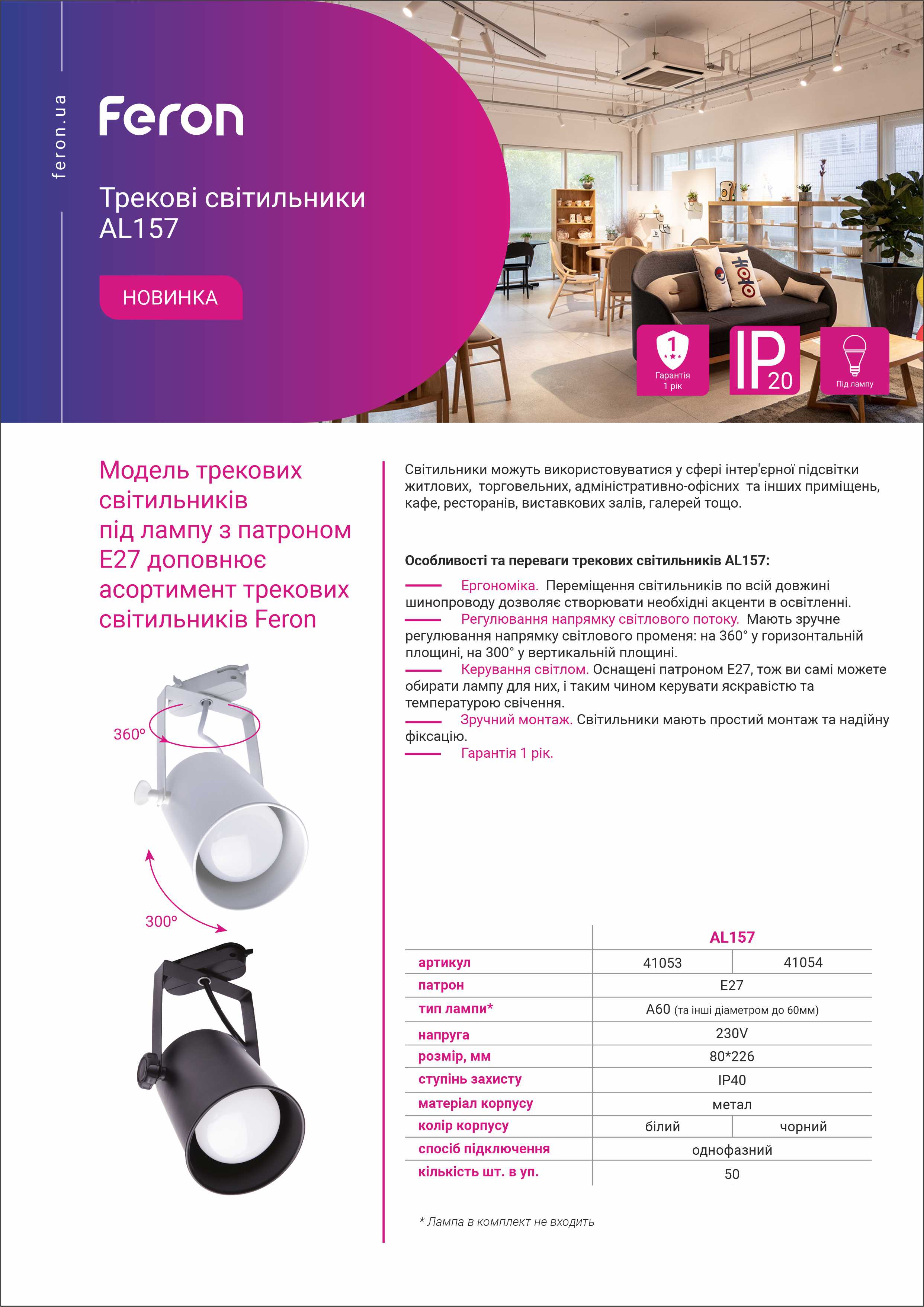 Однофазні трекові системи - дуже популярне рішення у сфері інтер’єрної підсвітки торговельних, житлових та інших приміщень. Це найкращий варіант для створення акцентного освітлення, вони підкреслюють деталі інтер’єру або можуть перетворити будинок у справжню арт-галерею. Світильник оснащений патроном Е27, тож ви самі можете обирати лампу для них і таким чином керувати яскравістю та температурою свічення. Трекові світильники Feron® можуть переміщюватись по всій довжині шинопроводу, що дозволяє використовувати їх як для акцентної підсвітки, так і для основного освітлення. У світильників зручно регулювати напрямок світлового променя: на 360° по горизонтальній осі, на 300° по вертикальній осі.