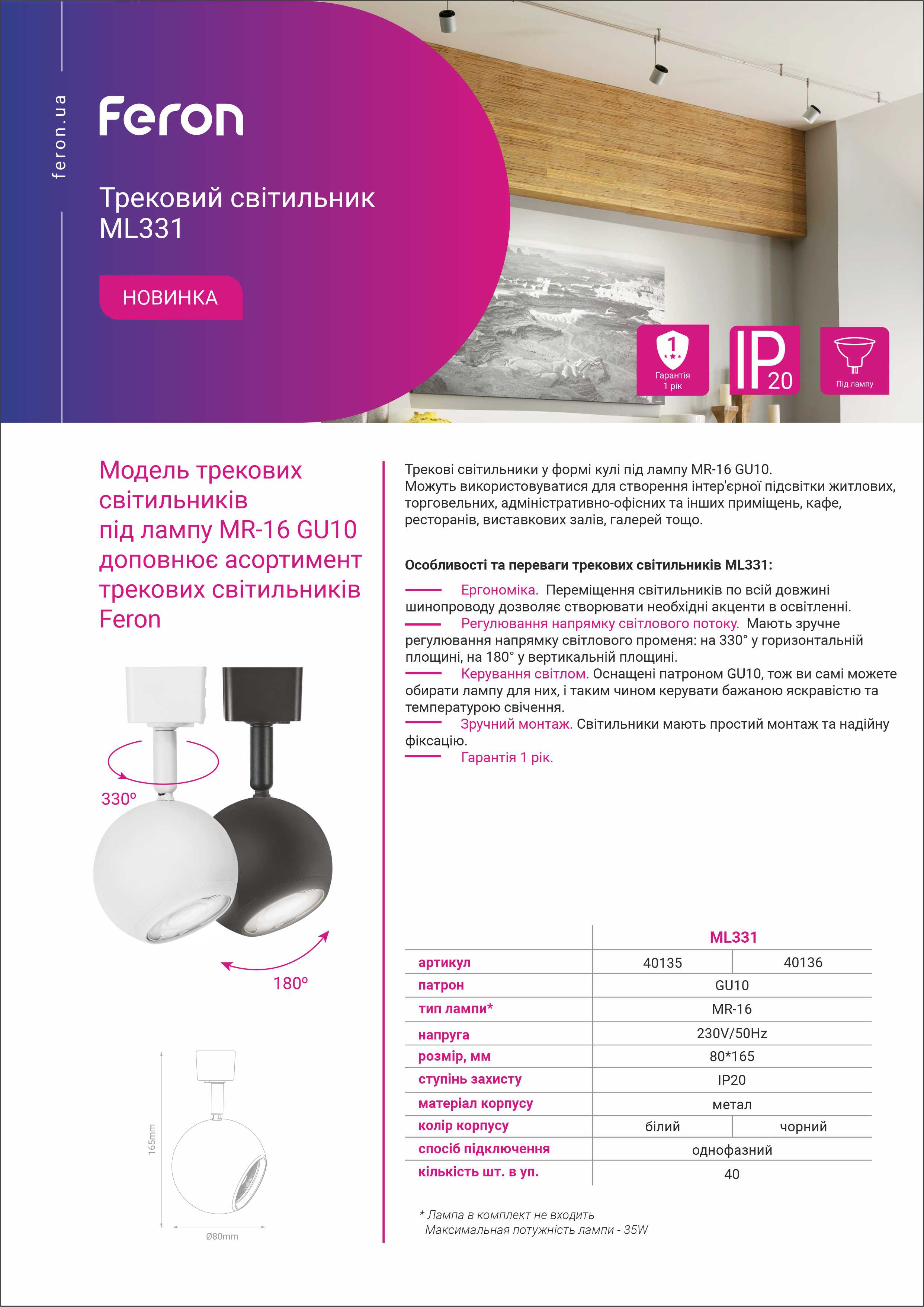 Модель трекових світильників ML331 під лампу MR16 GU10 доповнює асортименти трекових світильників Feron.