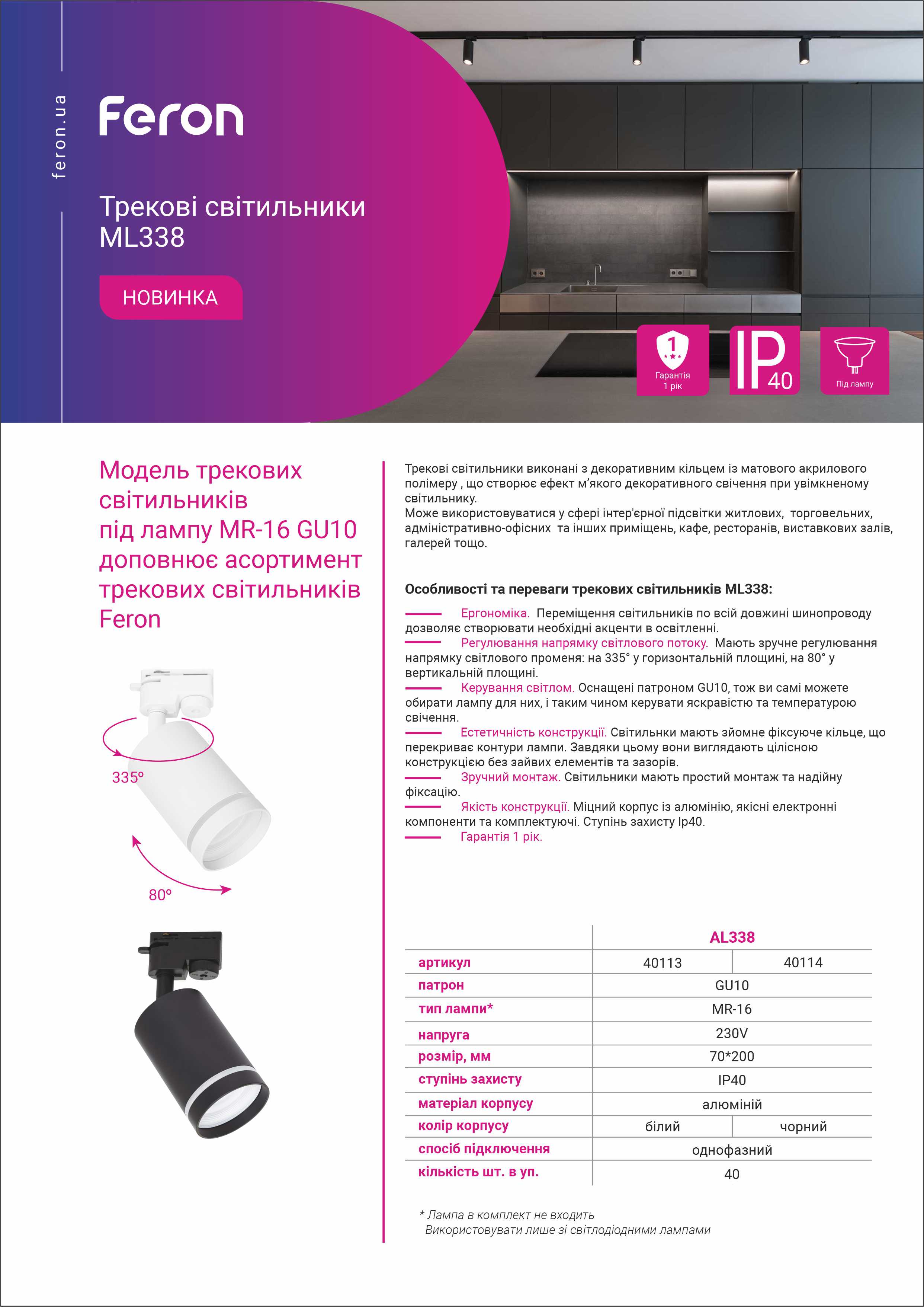 | Тип світильника | трековий |