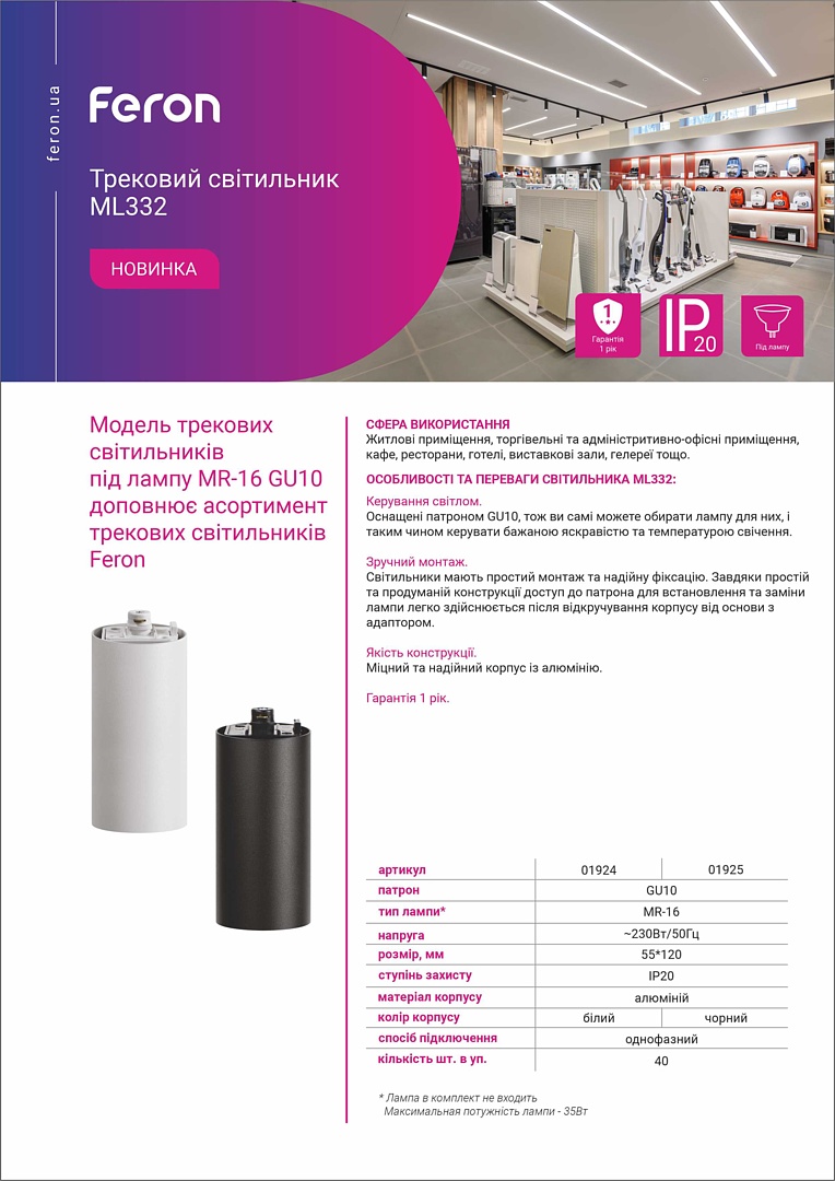Лаконічні трекові світильники для інтер'єрної підсвітки житлових, торговельних, адміністративно-офісних та інших приміщень, кафе, ресторанів, виставкових залів, галерей тощо. Простий та універсальний дизайн і компактні розміри дозволяють встановити такий світильник у будь-якому інтер'єрі.