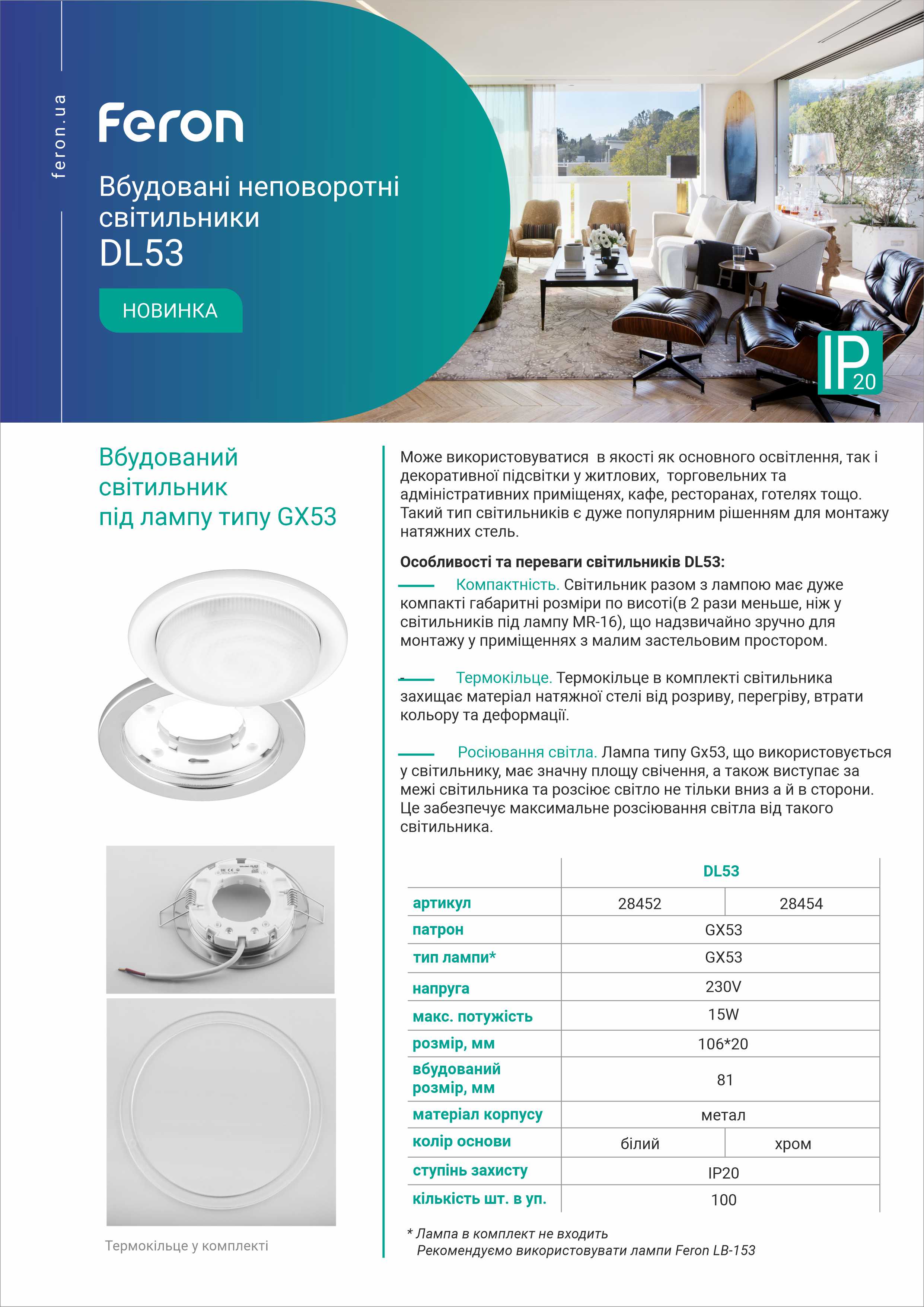 Світильник DL53 може використовуватися в якості як основного освітлення, так і декоративної підсвітки у житлових, торгівельних та адміністративних приміщенях, кафе, ресторанах, готелях тощо. Світильник разом з лампою має дуже компактні розміри по висоті ( в 2 рази меньше, ніж у світильників під лампу MR-16), що надзвичайно зручно для монтажу у приміщеннях з малим застельовим простором. Лампа типу GX53, що використовується у світильнику, має значну площу свічення, а також виступає за межі світильника та розсіює світло не тільки вниз, а й в сторони. Це забезпечує максимальне розсіювання світла від такого світильника. До компелекту світильника входить термокільце, яке захищає матеріал натяжної стелі від розриву, перегрів, втрати кольору та деформації.