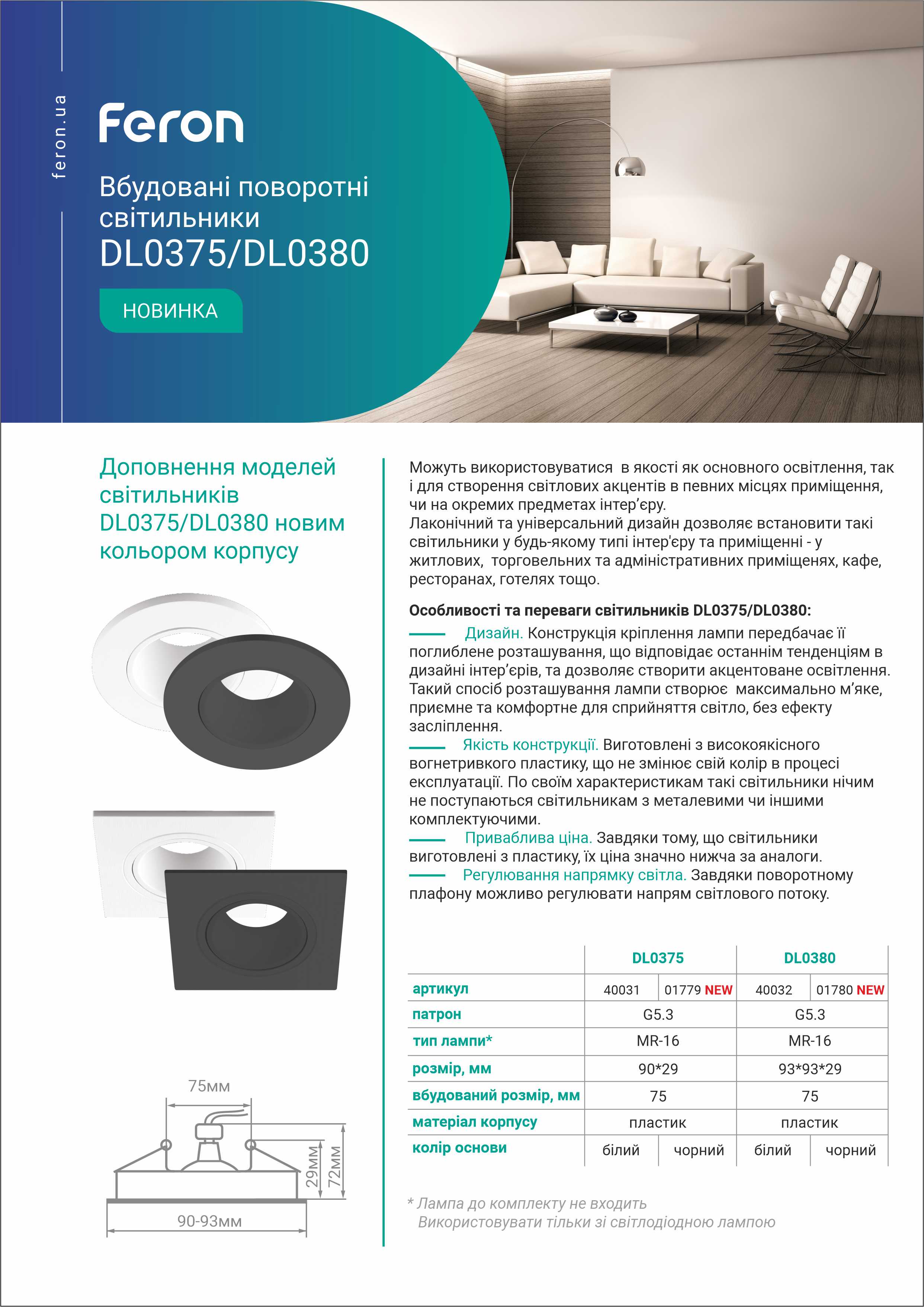Світильник DL0375 може використовуватися в якості як основного освітлення, так і для світлових акцентів в певних ділянках приміщення, чи на окремих предметах інтер'єру. Лаконічний та універсальний дизайн дозволяє встановити такі світильники у будь-якому типі інтер'єру та приміщенні - у житлових, торгівельних та адміністративних приміщенях, кафе, ресторанах, готелях тощо. Конструкція кріплення лампи передбачає її поглиблене розташування, що відповідає останнім тенденціям в дизайні інтер'єрів, та дозволяє створити акцентоване освітлення. Такий спосіб розташування лампи створює максимально м'яке, приємне та комфортне для сприйняття світла, без ефекту засліплення. Светильник виготовленний з високоякісного термостійкого пластику, що не жовтіє в процесі експлуатації. По своїм характеристикам такі світильник нічим не поступаються світильникам з металевими чи іншими комплектуючими. Завдяки поворотному плафону можливо регулювати напрям світлового потоку.