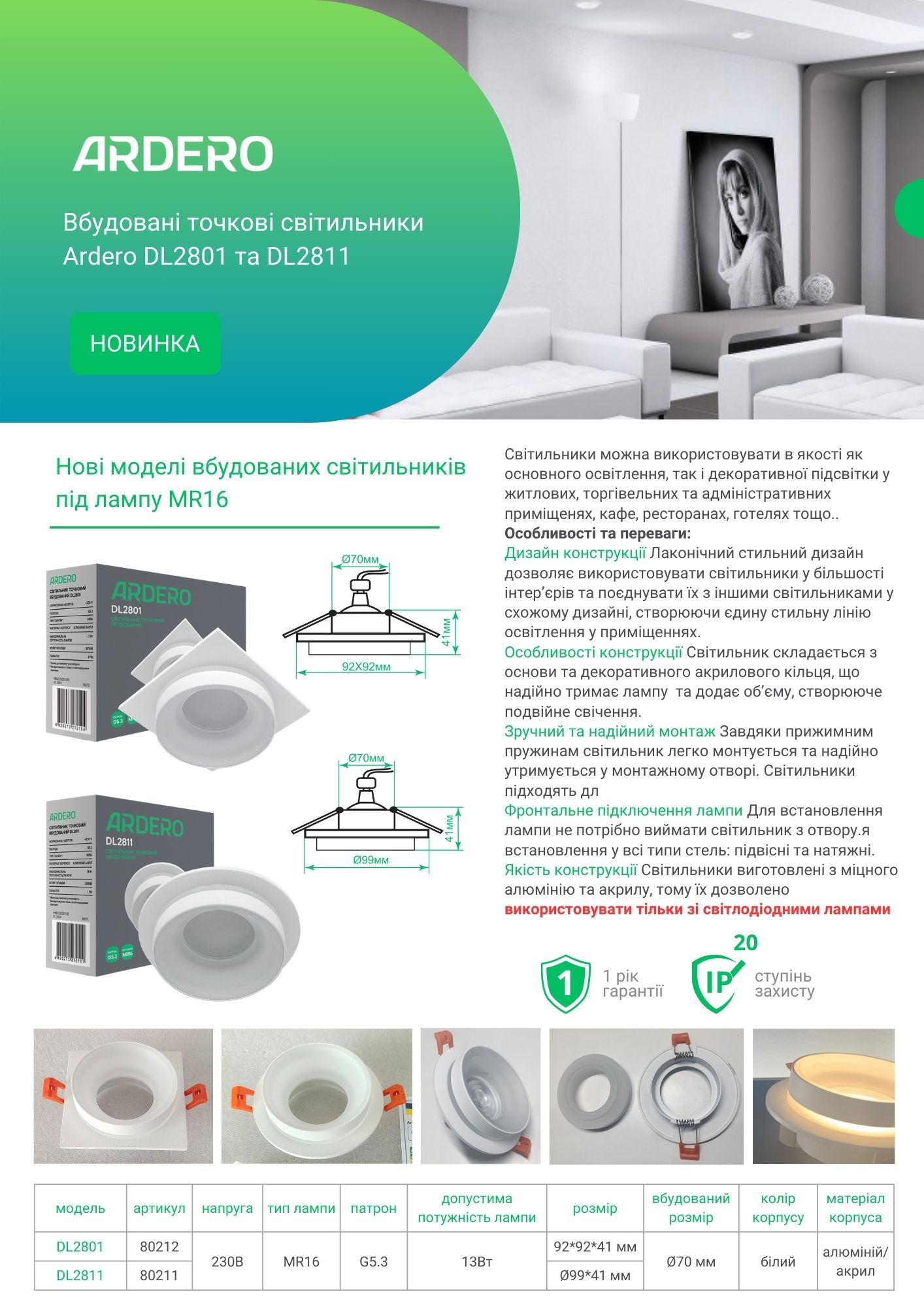 Зручний та надійний монтаж. Завдяки прижимним пружинам світильник легко монтується та надійно утримується у монтажному отворі. Світильники підходять для установки у всі типи стель: підвісні та натяжні.