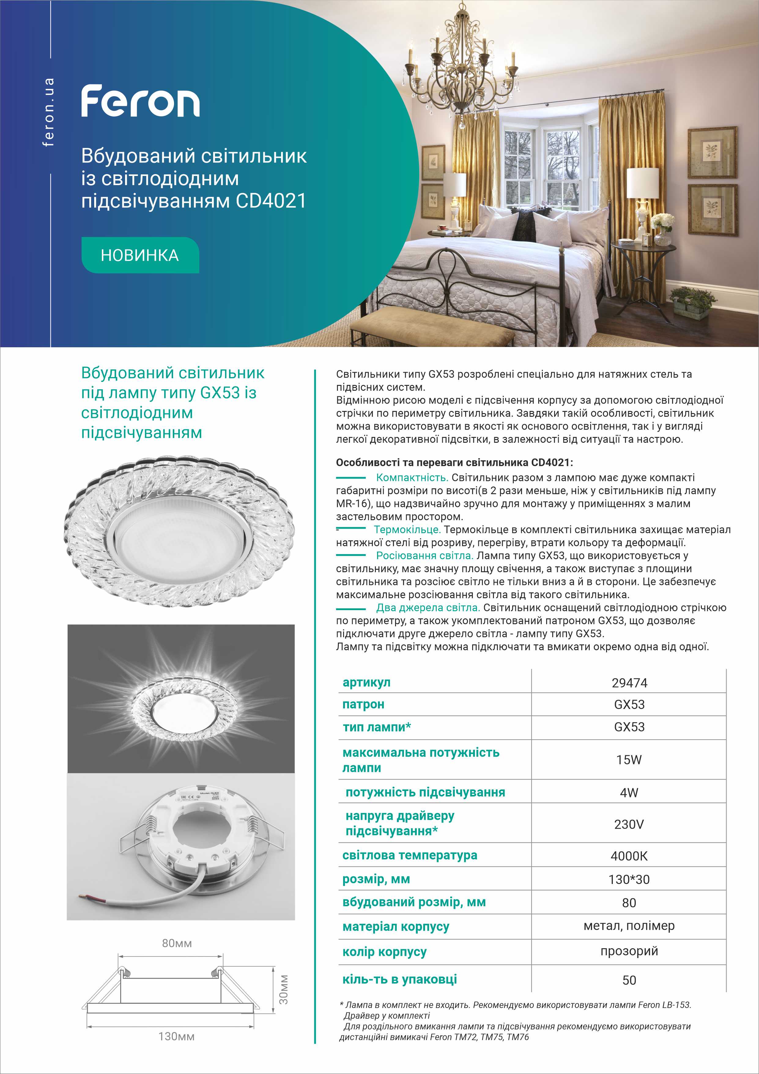 Відмінною рисою світильників такого типу, є підсвічення корпусу за допомогою світлодіодної стрічки по периметру світильника. Завдяки такій особливості, світильник можна використовувати в якості як основного освітлення, так і увигляді легкої декоративної підсвітки. Світильник разом з лампою має дуже компактні розміри по висоті ( в 2 рази меньше, ніж у світильників під лампу MR-16), що надзвичайно зручно для монтажу у приміщеннях з малим застельовим простором. Лампа типу GX53, що використовується у світильнику, має значну площу свічення, а також виступає за межі світильника та розсіює світло не тільки вниз, а й в сторони. Це забезпечує максимальне розсіювання світла від такого світильника. До компелекту світильника входить термокільце, яке захищає матеріал натяжної стелі від розриву, перегрів, втрати кольору та деформації. Світильник оснащений двома джерелами світла: цоколем GX53 під світлодіодну лампу типу GX53, та світлодіодною підсвіткою по периметру світильника. Лампу та світлодіоди підсвітки можна підключати окремо та використовувати як різни типи освітлення. Світлодіоди світильника можуть працювати без вмикання лампи. Рекомендовано використовувати тільки зі світлодіодними лампами та з дистанційними вимикачами Feron.