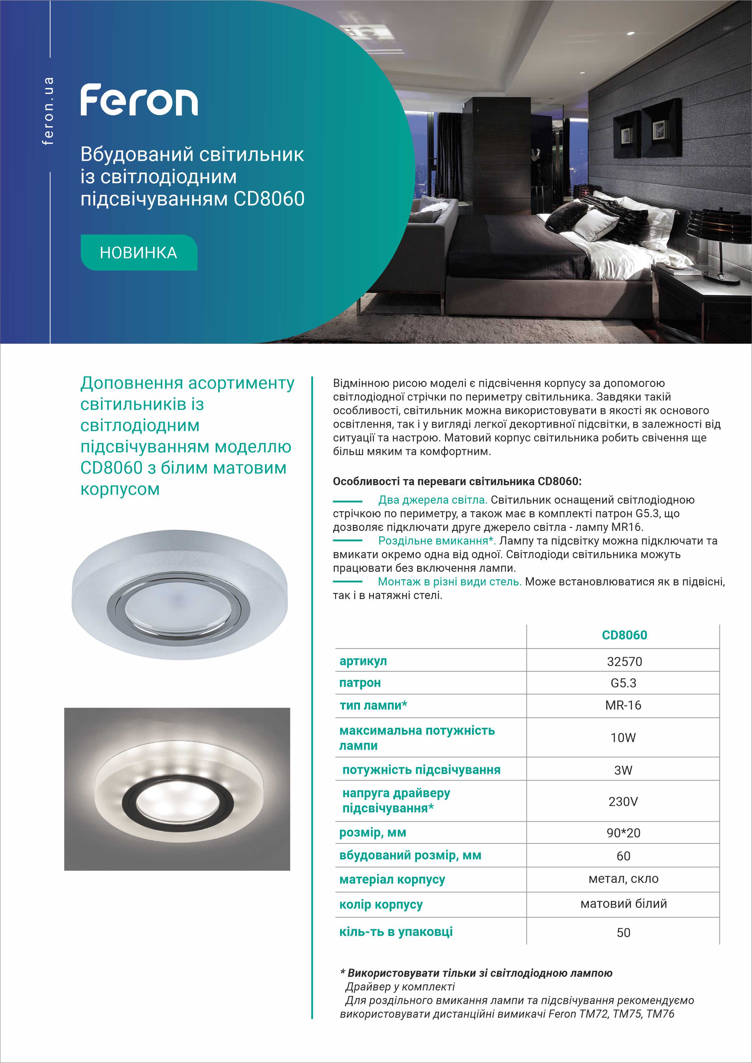 Вбудований світильник зі світлодіодним підсвічуванням(LED стрічка в основі). Таким чином він оснащений двома джерелами світла: цоколем G5.3 під світлодіодну лампу типу MR-16, та світлодіодною підсвіткою по периметру світильника. Лампу та світлодіоди підсвітки можна підключати окремо та використовувати як різни типи освітлення. Світлодіоди світильника можуть працювати без вмикання лампи. Рекомендовано використовувати тільки зі світлодіодними лампами та з дистанційними вимикачами Feron.