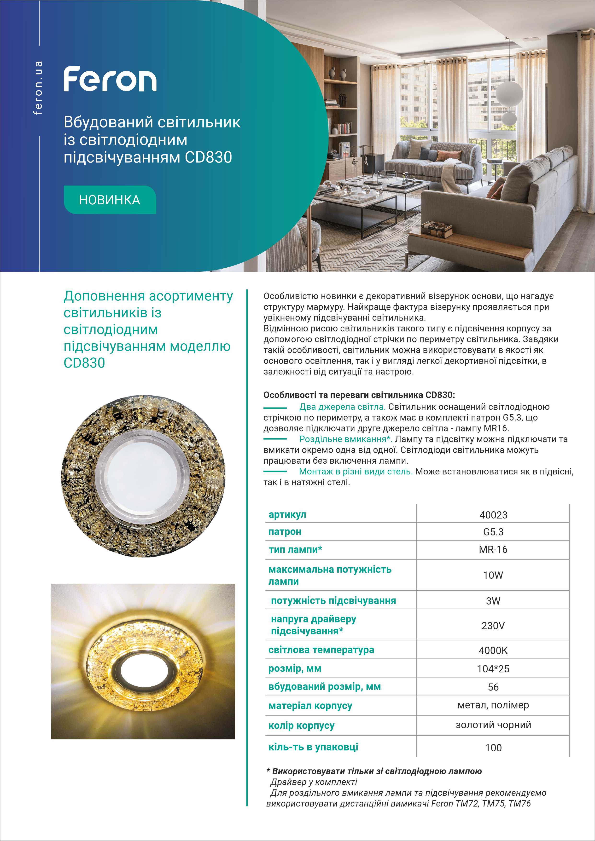 Особливістю світильника є декоративний візерунок основи, що нагадує структуру мармуру. Найкраще фактура візерунку проявляється при увімкненому підсвічуванні світильника. Відмінною рисою світильників такого типу, є підсвічення корпусу за допомогою світлодіодної стрічки по периметру світильника. Завдяки такій особливості, світильник можна використовувати в якості як основного освітлення, так і увигляді легкої декоративної підсвітки. Світильник оснащений двома джерелами світла: цоколем G5.3 під світлодіодну лампу типу MR-16, та світлодіодною підсвіткою по периметру світильника. Лампу та світлодіоди підсвітки можна підключати окремо та використовувати як різни типи освітлення. Світлодіоди світильника можуть працювати без вмикання лампи. Рекомендовано використовувати тільки зі світлодіодними лампами та з дистанційними вимикачами Feron.