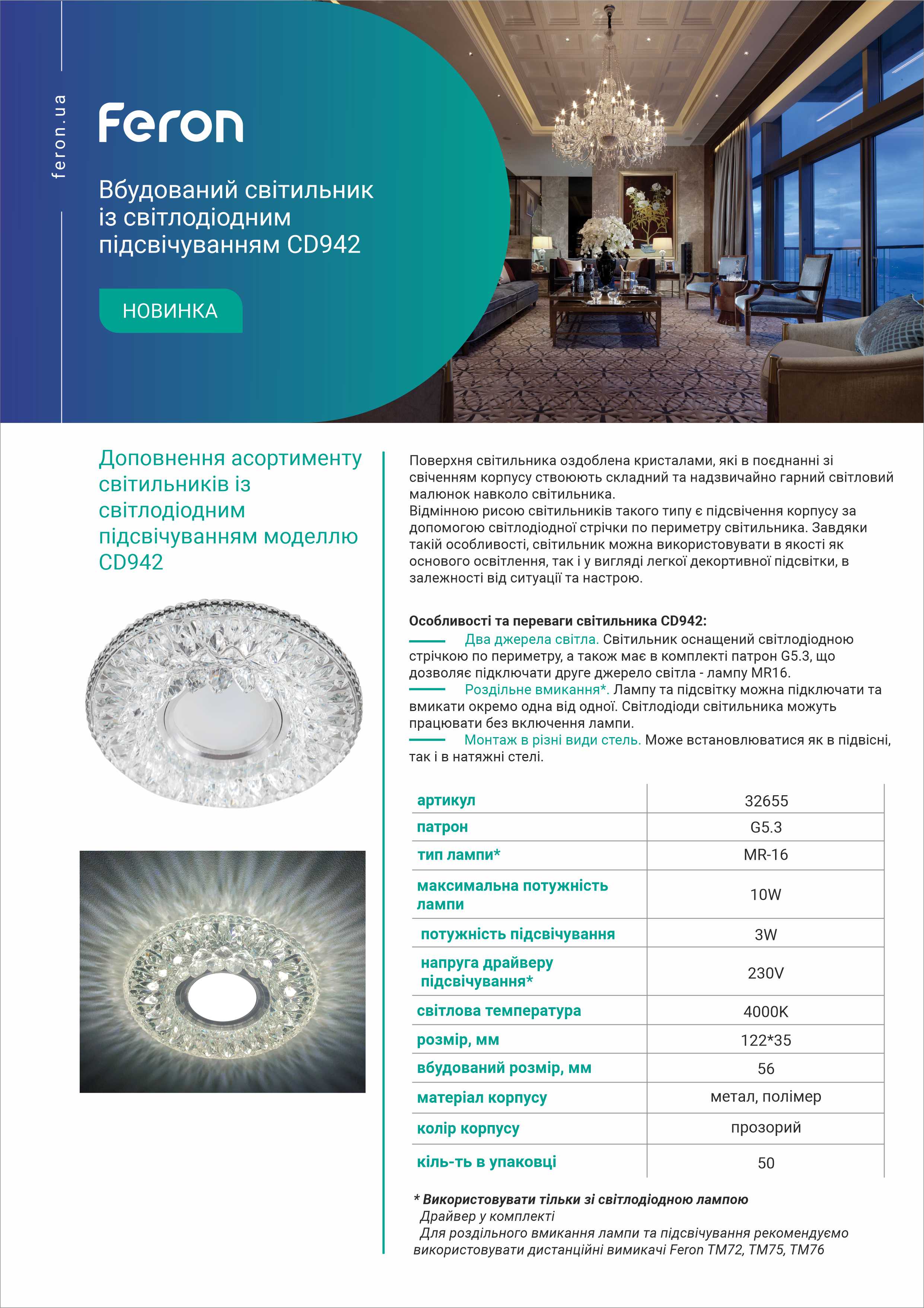 Поверхня світильника оздоблена кристалами, які в поєднанні зі свіченням корпусу, створюють складний та надзвичайно гарний світловий малюнок навколо світильника. Відмінною рисою світильників такого типу, є підсвічення корпусу за допомогою світлодіодної стрічки по периметру світильника. Завдяки такій особливості, світильник можна використовувати в якості як основного освітлення, так і увигляді легкої декоративної підсвітки. Світильник оснащений двома джерелами світла: цоколем G5.3 під світлодіодну лампу типу MR-16, та світлодіодною підсвіткою по периметру світильника. Лампу та світлодіоди підсвітки можна підключати окремо та використовувати як різни типи освітлення. Світлодіоди світильника можуть працювати без вмикання лампи. Рекомендовано використовувати тільки зі світлодіодними лампами та з дистанційними вимикачами Feron.