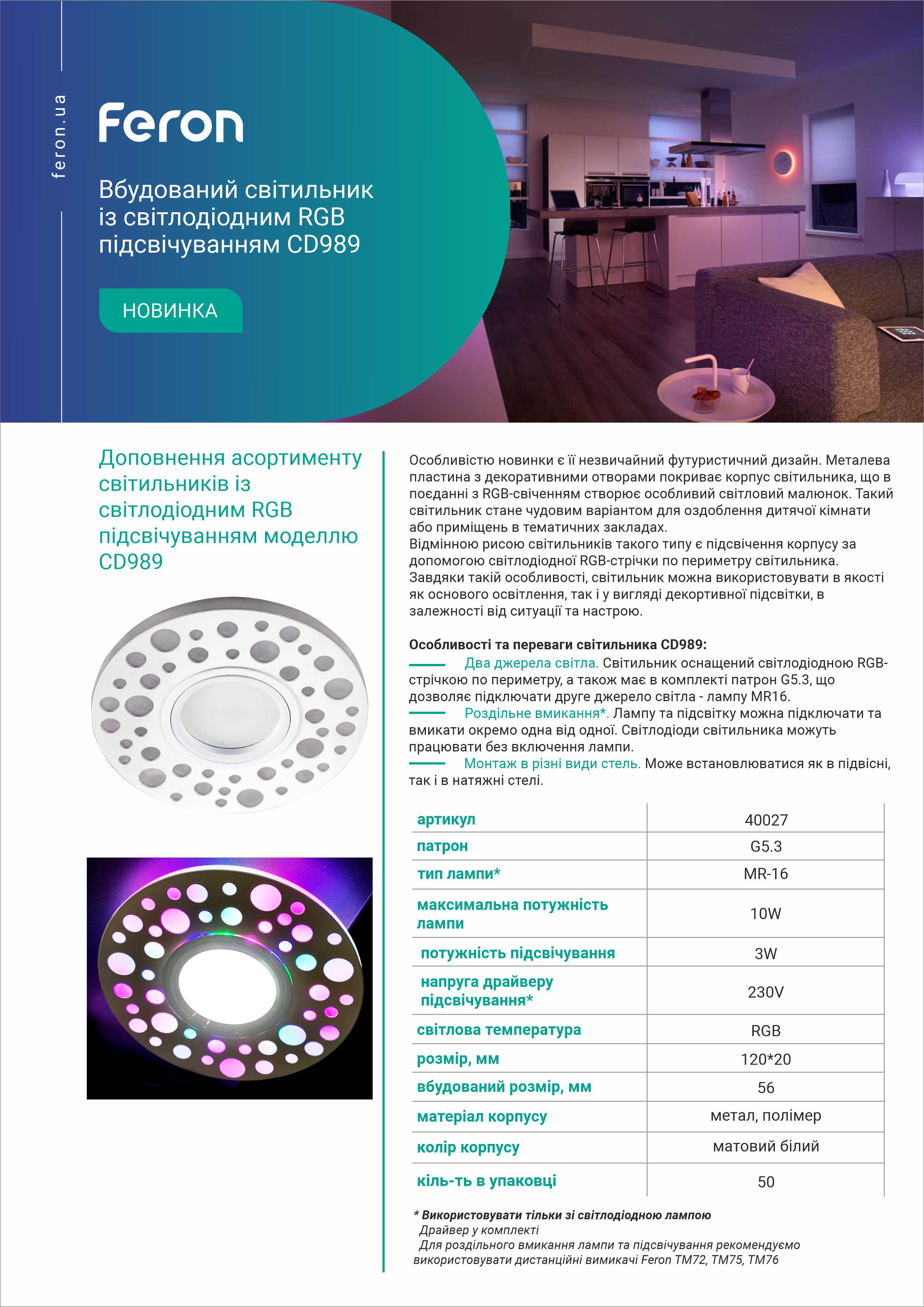 Особливістю світильника є незвичайний футуристичний дизайн. Металева пластина з декоративними отворами покриває корпус світильника, що в поєднанні з RGB-свіченням створює особливий малюнок. Такий світильник стане чудовим варіантом для оздоблення дитячої кімнати або приміщень в тематичних закладах. Відмінною рисою світильників такого типу, є підсвічення корпусу за допомогою світлодіодної RGB-стрічки по периметру світильника. Завдяки такій особливості, світильник можна використовувати в якості як основного освітлення, так і увигляді легкої декоративної підсвітки. Світильник оснащений світлодіодною RGB-стрічкою по периметру, а також має в комплекті патрон G5.3, що дозволяє підключати друге джерело світла-лампу MR-16. Лампу та світлодіоди підсвітки можна підключати окремо та використовувати як різни типи освітлення. Світлодіоди світильника можуть працювати без вмикання лампи. Рекомендовано використовувати тільки зі світлодіодними лампами та з дистанційними вимикачами Feron.