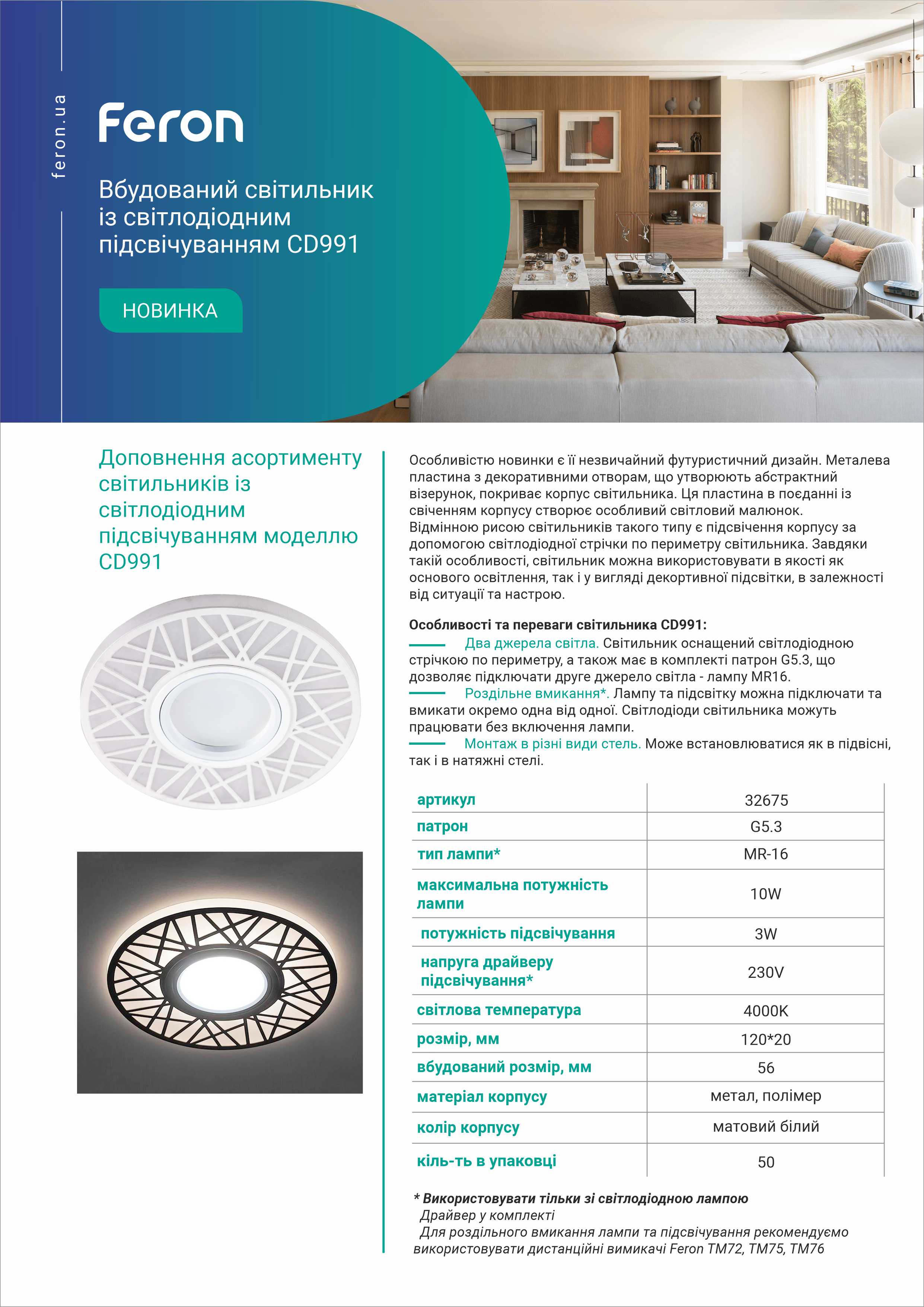 Особливістю світильника є незвичайний футуристичний дизайн. Металева пластина з декоративними отворами, що утворюють абстрактний візерунок, покриває корпус світильника. Ця пластина в поєднанні із свіченням корпусу створює особливий світловий малюнок. Відмінною рисою світильників такого типу, є підсвічення корпусу за допомогою світлодіодної стрічки по периметру світильника. Завдяки такій особливості, світильник можна використовувати в якості як основного освітлення, так і увигляді легкої декоративної підсвітки. Світильник оснащений двома джерелами світла: цоколем G5.3 під світлодіодну лампу типу MR-16, та світлодіодною підсвіткою по периметру світильника. Лампу та світлодіоди підсвітки можна підключати окремо та використовувати як різни типи освітлення. Світлодіоди світильника можуть працювати без вмикання лампи. Рекомендовано використовувати тільки зі світлодіодними лампами та з дистанційними вимикачами Feron.