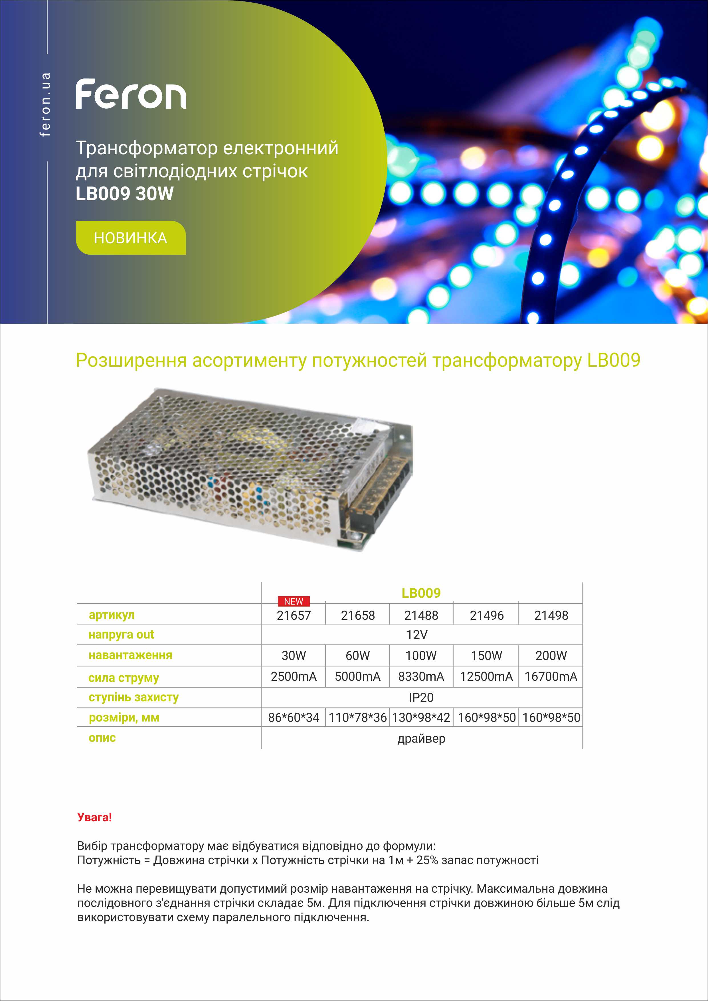 Оберіть електронний трансформатор Feron LB009 для надійного та ефективного живлення світлодіодних стрічок у вашому інтер'єрі та насолоджуйтеся яскравим та економічним освітленням.