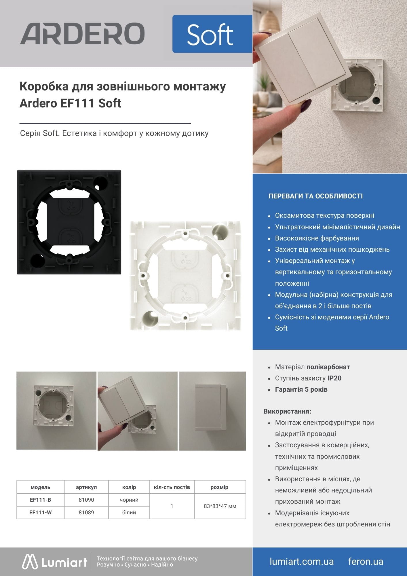 Електрофурнітура Ardero Soft для дому та комерційних приміщень — оптимальне рішення для квартир і будинків, офісів, бізнес-центрів, готелів, ресторанів і торгових об’єктів. Підходить для сучасних інтер’єрів: світлий мінімалізм (скандинавський стиль), сучасний стриманий дизайн, технологічний стиль (smart home, high-tech), а також преміум інтер’єри — дизайнерські апартаменти, шоуруми, готелі. Розетки та вимикачі Ardero Soft розраховані на інтенсивне використання, зберігають зовнішній вигляд роками, ідеально підходять для дизайнерських проєктів та призначені для використання всередині приміщень.