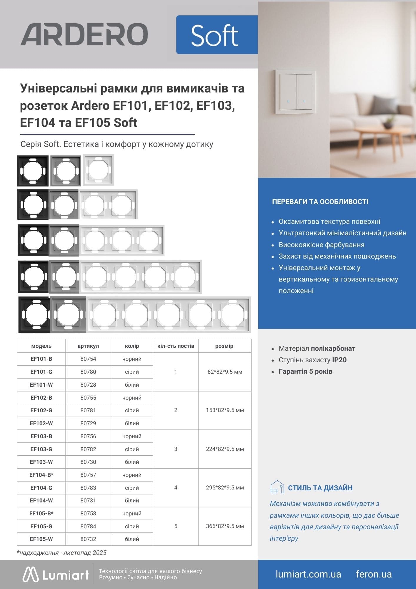 Універсальне положення рамок (вертикальне і горизонтальне) дозволяє виконувати монтаж у будь-якій орієнтації залежно від задачі та дизайну простору. Це важлива конкурентна перевага на ринку електрофурнітури, яка вигідно вирізняє Ardero Soft серед інших пропозицій. Рамки для розеток і вимикачів ідеально підходять для сучасних, мінімалістичних і дизайнерських інтер’єрів, а також для житлових і комерційних приміщень, забезпечуючи зручність встановлення, естетику та максимальну гнучкість у реалізації дизайн-рішень.