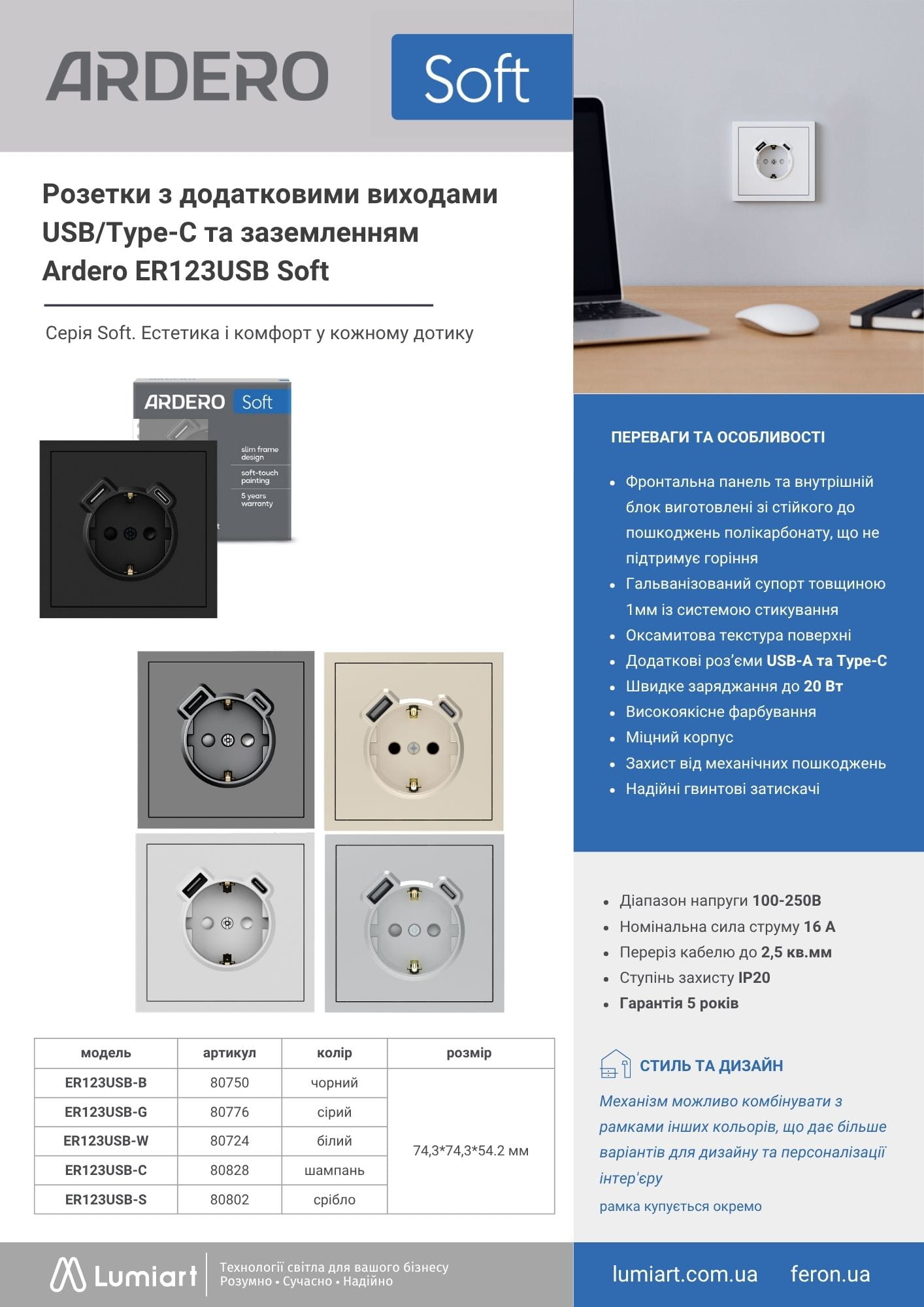 Електрофурнітура Ardero Soft для дому та комерційних приміщень — оптимальне рішення для квартир і будинків, офісів, бізнес-центрів, готелів, ресторанів і торгових об’єктів. Підходить для сучасних інтер’єрів: світлий мінімалізм (скандинавський стиль), сучасний стриманий дизайн, технологічний стиль (smart home, high-tech), а також преміум інтер’єри — дизайнерські апартаменти, шоуруми, готелі. Розетки та вимикачі Ardero Soft розраховані на інтенсивне використання, зберігають зовнішній вигляд роками, ідеально підходять для дизайнерських проєктів та призначені для використання всередині приміщень.