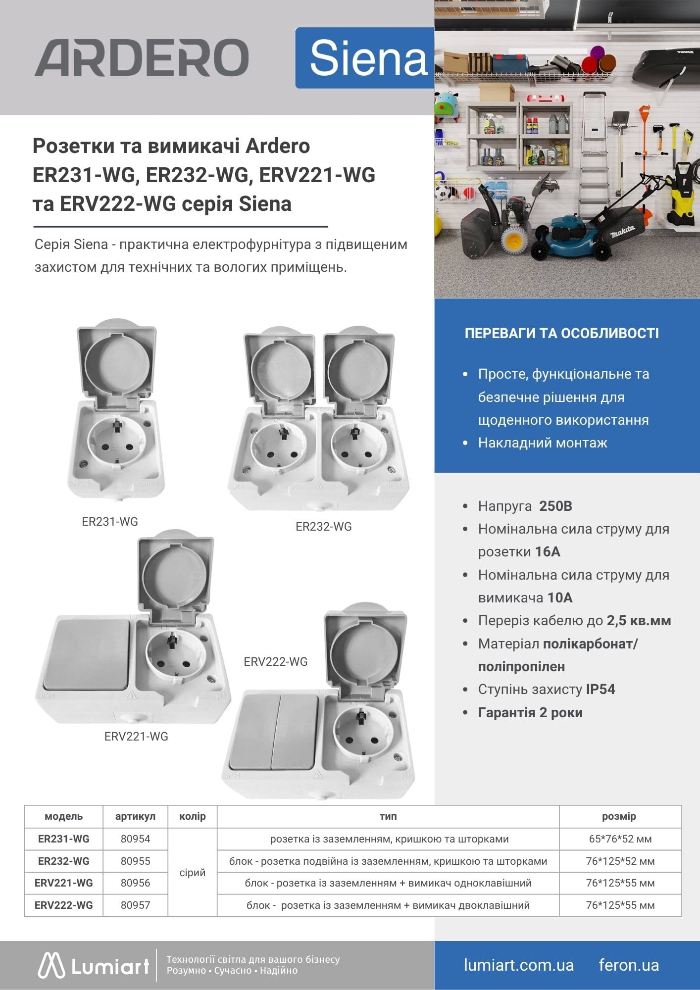 ER232-WG Ardero Siena IP54 — подвійна вологозахищена розетка 16А із заземленням, кришками та шторками. Накладний монтаж. Ідеальна для гаража, майстерні, складу та вулиці. Захист від пилу та вологи, підключення двох пристроїв одночасно.