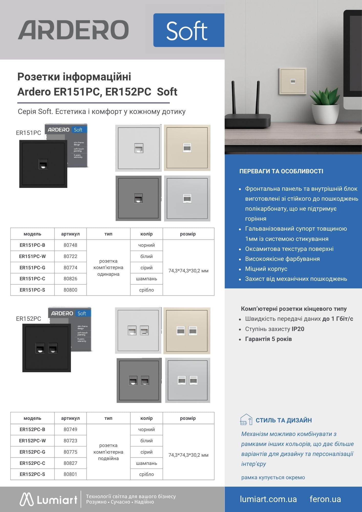 Електрофурнітура Ardero Soft для дому та комерційних приміщень — оптимальне рішення для квартир і будинків, офісів, бізнес-центрів, готелів, ресторанів і торгових об’єктів. Підходить для сучасних інтер’єрів: світлий мінімалізм (скандинавський стиль), сучасний стриманий дизайн, технологічний стиль (smart home, high-tech), а також преміум інтер’єри — дизайнерські апартаменти, шоуруми, готелі. Розетки та вимикачі Ardero Soft розраховані на інтенсивне використання, зберігають зовнішній вигляд роками, ідеально підходять для дизайнерських проєктів та призначені для використання всередині приміщень.