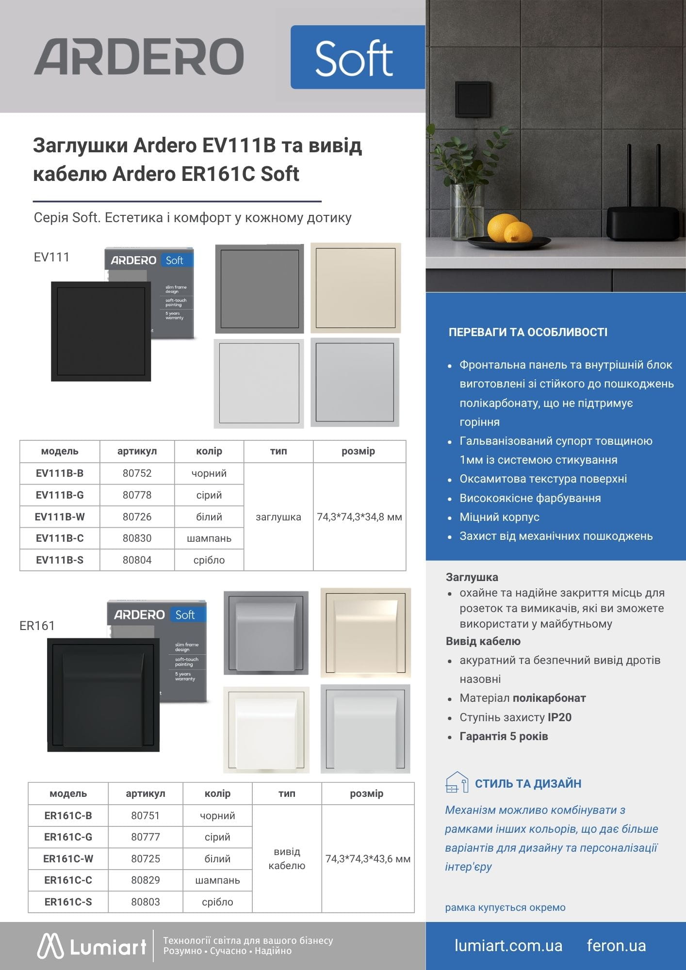 Електрофурнітура Ardero Soft для дому та комерційних приміщень — оптимальне рішення для квартир і будинків, офісів, бізнес-центрів, готелів, ресторанів і торгових об’єктів. Підходить для сучасних інтер’єрів: світлий мінімалізм (скандинавський стиль), сучасний стриманий дизайн, технологічний стиль (smart home, high-tech), а також преміум інтер’єри — дизайнерські апартаменти, шоуруми, готелі. Розетки та вимикачі Ardero Soft розраховані на інтенсивне використання, зберігають зовнішній вигляд роками, ідеально підходять для дизайнерських проєктів та призначені для використання всередині приміщень.