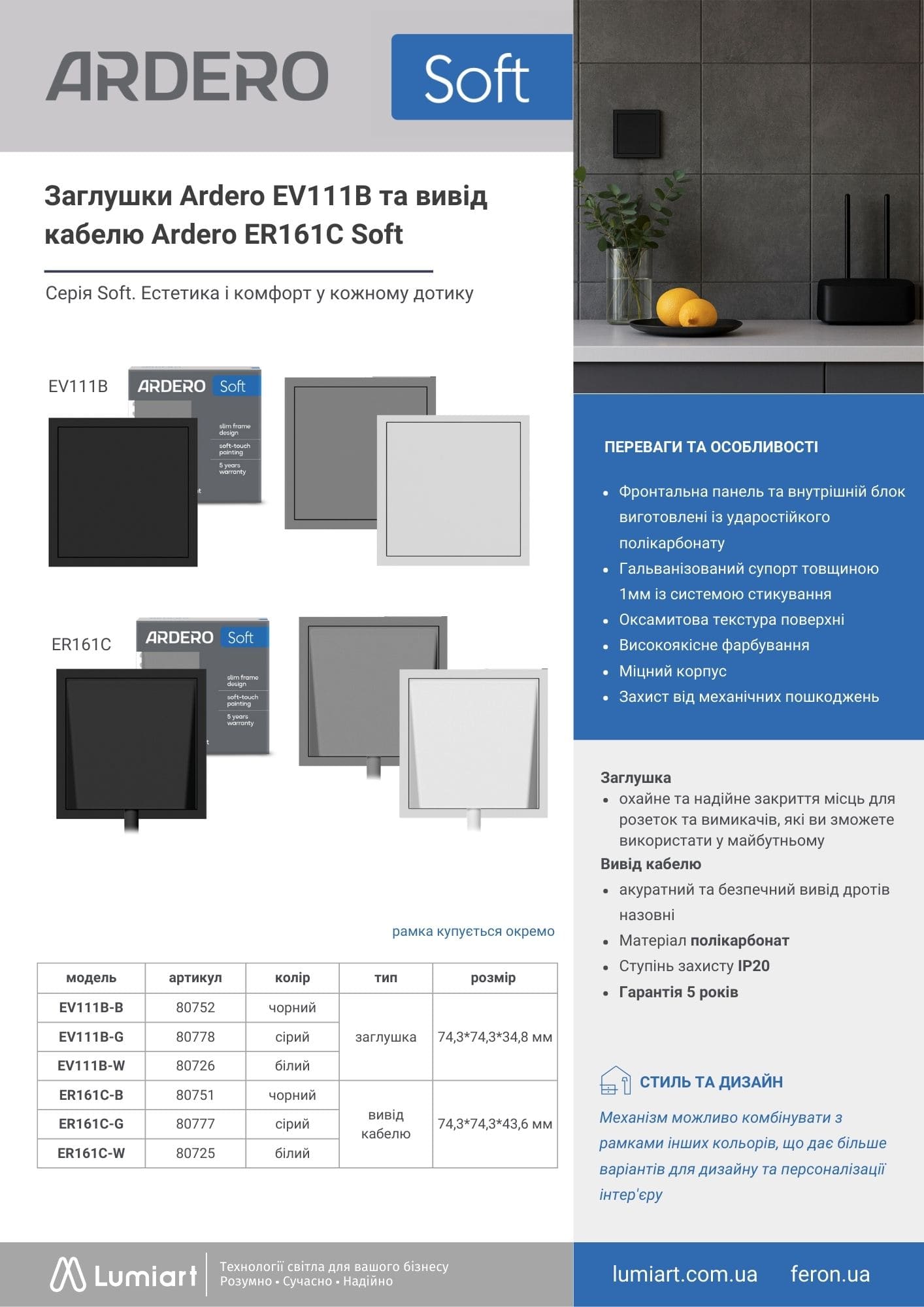 Електрофурнітура Ardero Soft для дому та комерційних приміщень — оптимальне рішення для квартир і будинків, офісів, бізнес-центрів, готелів, ресторанів і торгових об’єктів. Підходить для сучасних інтер’єрів: світлий мінімалізм (скандинавський стиль), сучасний стриманий дизайн, технологічний стиль (smart home, high-tech), а також преміум інтер’єри — дизайнерські апартаменти, шоуруми, готелі. Розетки та вимикачі Ardero Soft розраховані на інтенсивне використання, зберігають зовнішній вигляд роками, ідеально підходять для дизайнерських проєктів та призначені для використання всередині приміщень.