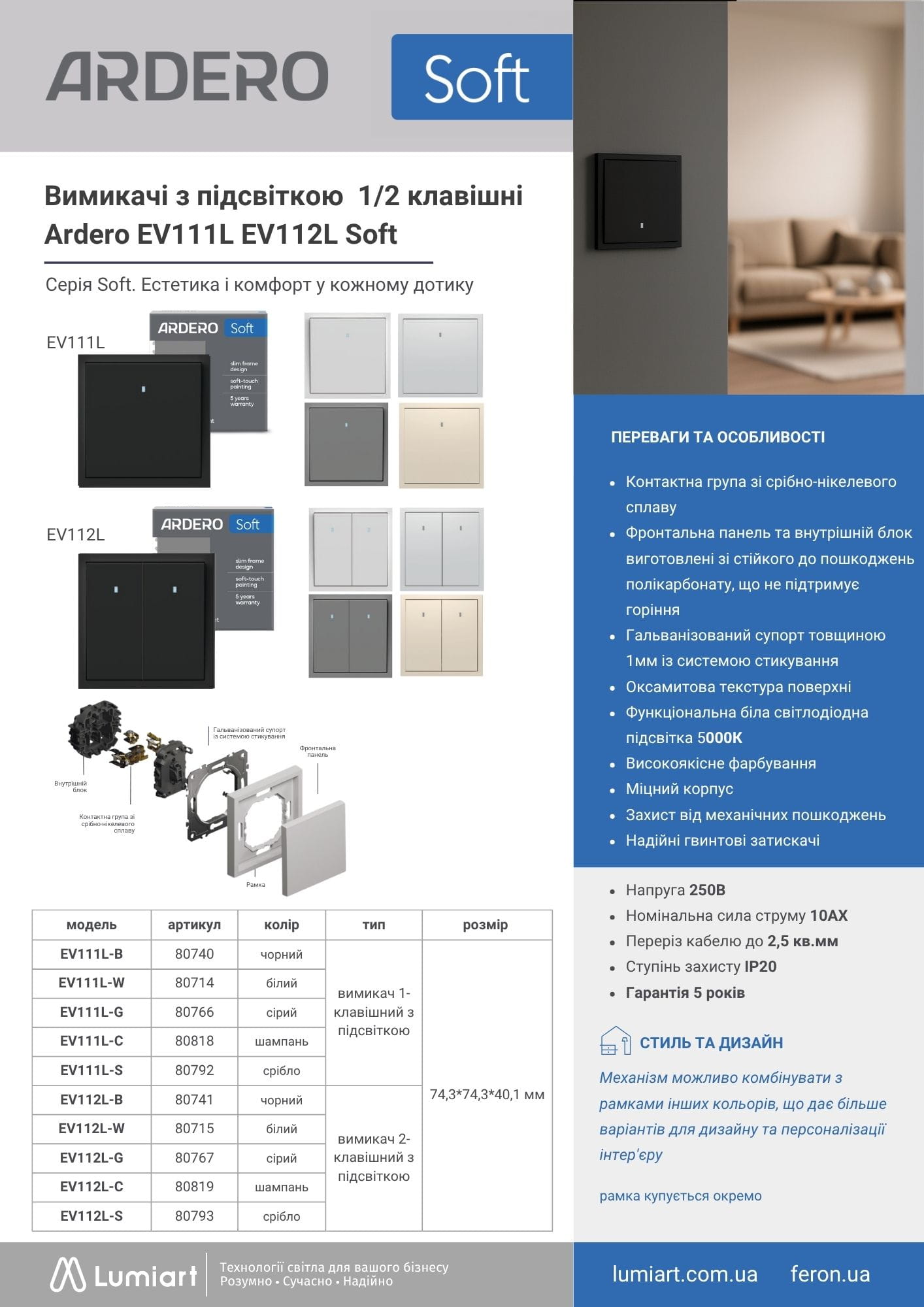 Електрофурнітура Ardero Soft для дому та комерційних приміщень — оптимальне рішення для квартир і будинків, офісів, бізнес-центрів, готелів, ресторанів і торгових об’єктів. Підходить для сучасних інтер’єрів: світлий мінімалізм (скандинавський стиль), сучасний стриманий дизайн, технологічний стиль (smart home, high-tech), а також преміум інтер’єри — дизайнерські апартаменти, шоуруми, готелі. Розетки та вимикачі Ardero Soft розраховані на інтенсивне використання, зберігають зовнішній вигляд роками, ідеально підходять для дизайнерських проєктів та призначені для використання всередині приміщень.