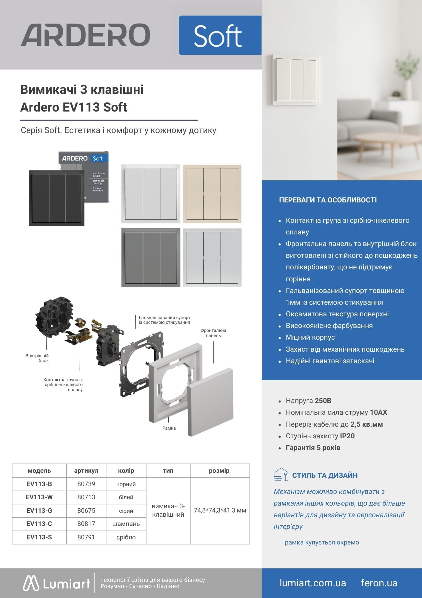 Електрофурнітура Ardero Soft для дому та комерційних приміщень — оптимальне рішення для квартир і будинків, офісів, бізнес-центрів, готелів, ресторанів і торгових об’єктів. Підходить для сучасних інтер’єрів: світлий мінімалізм (скандинавський стиль), сучасний стриманий дизайн, технологічний стиль (smart home, high-tech), а також преміум інтер’єри — дизайнерські апартаменти, шоуруми, готелі. Розетки та вимикачі Ardero Soft розраховані на інтенсивне використання, зберігають зовнішній вигляд роками, ідеально підходять для дизайнерських проєктів та призначені для використання всередині приміщень.