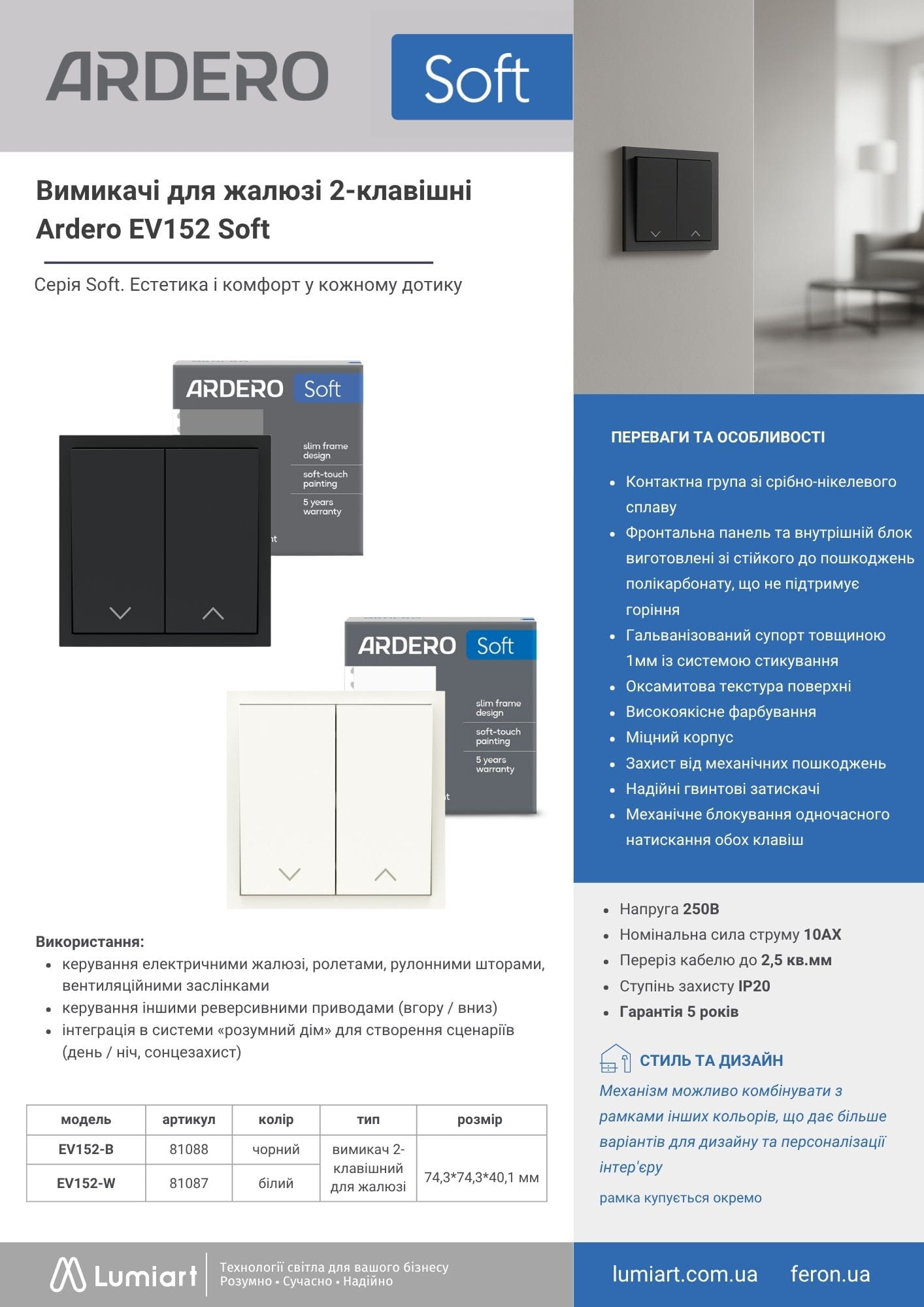 Ardero EV152 Soft — сучасний 2-клавішний вимикач для керування електричними жалюзі, ролетами та іншими реверсивними приводами. Модель поєднує функціональність, надійність і стильний мінімалістичний дизайн серії Soft, що гармонійно доповнює сучасні інтер’єри житлових і комерційних приміщень.