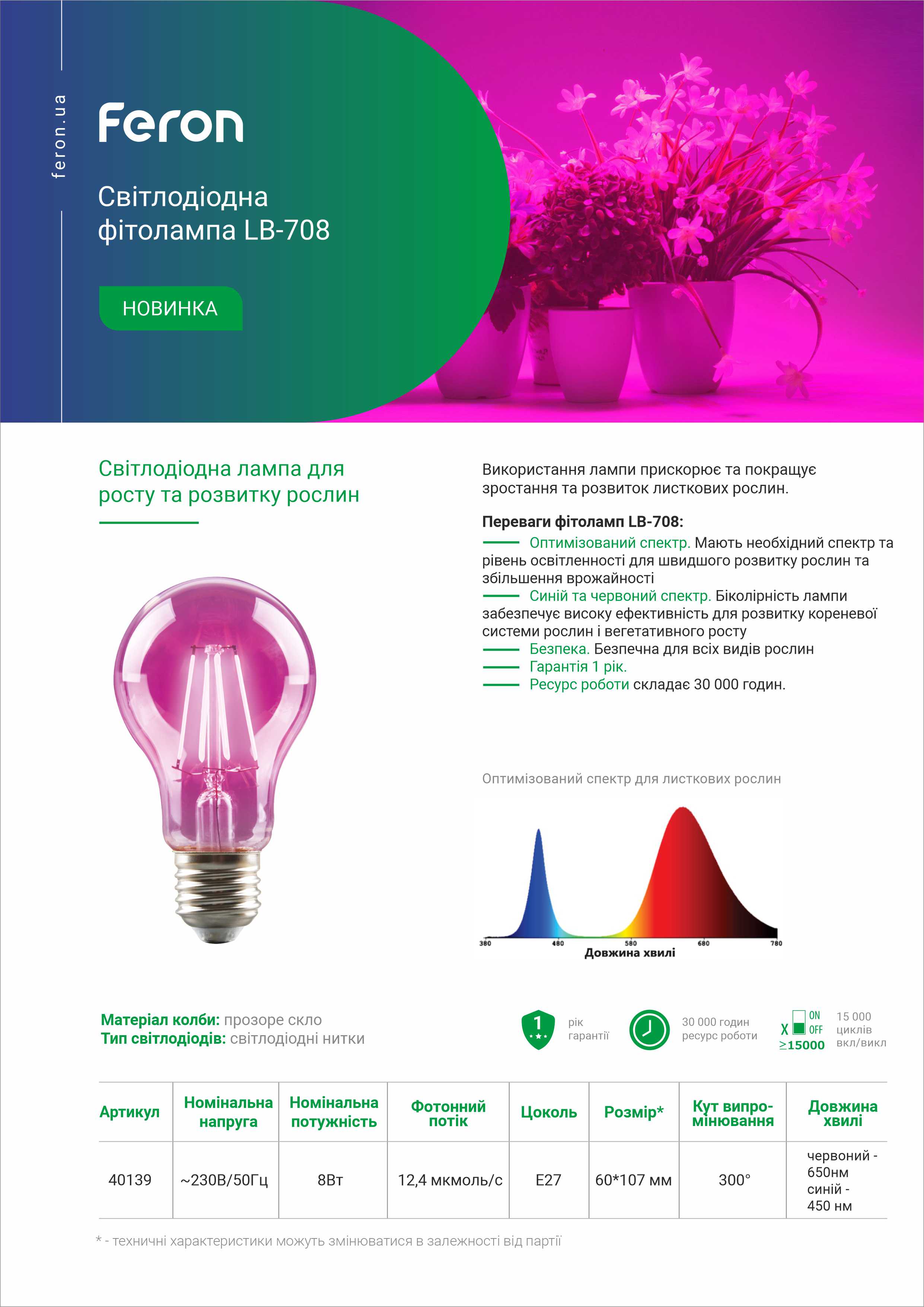 Світлодіодна фітолампа Feron LB 708 з прозорого скла зі світлодіодними нитками в якості джерела світла для росту та розвитку рослин.