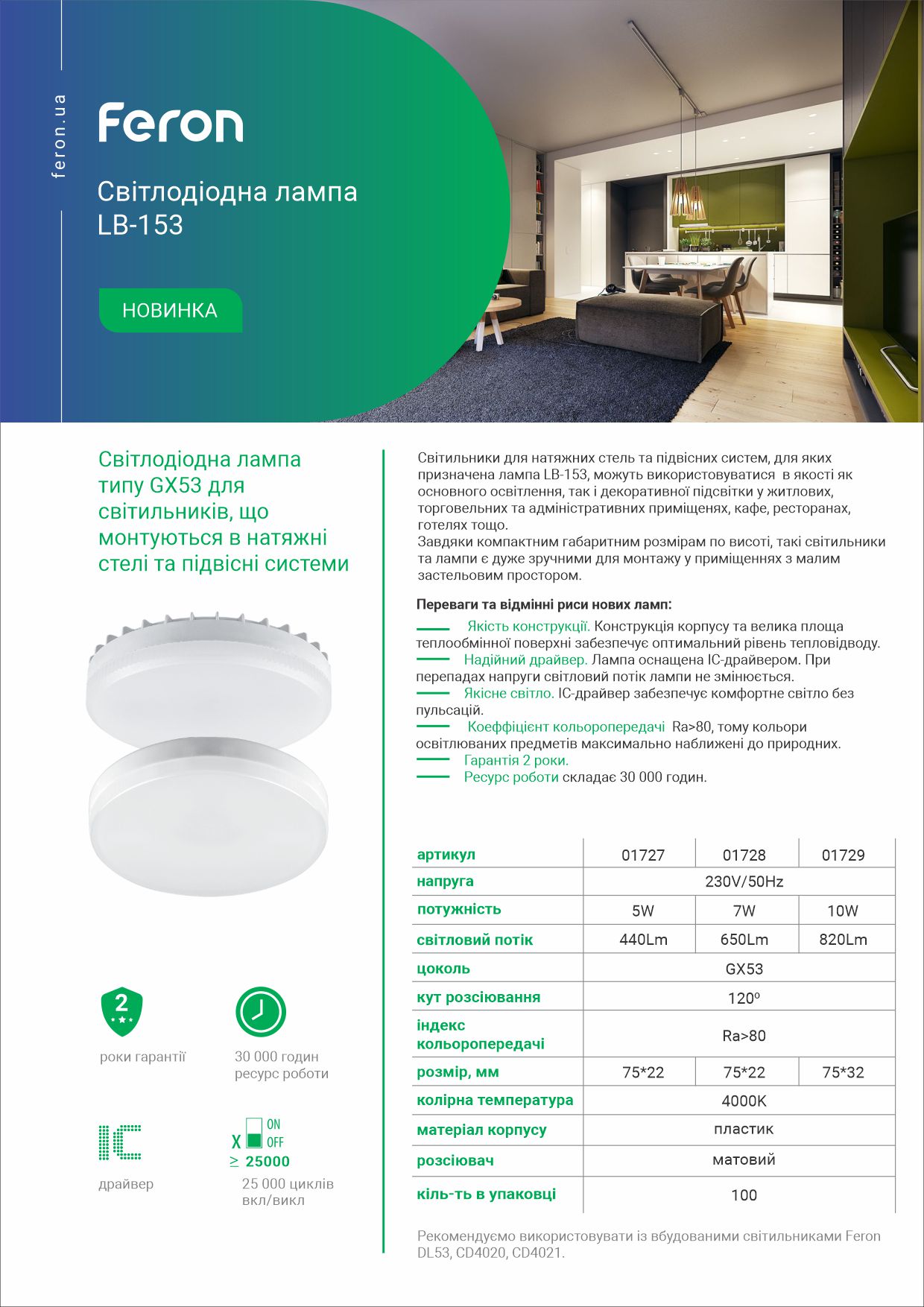 Лампа LB-153 призначена для різних типів світильників: стельових, накладних, декоративних, світильників підвісних систем та інших. Вони можуть використовуватися в якості як основного освітлення, так і декоративного у житлових, торгових та адміністративних приміщеннях, кафе, ресторанах, готелях тощо.