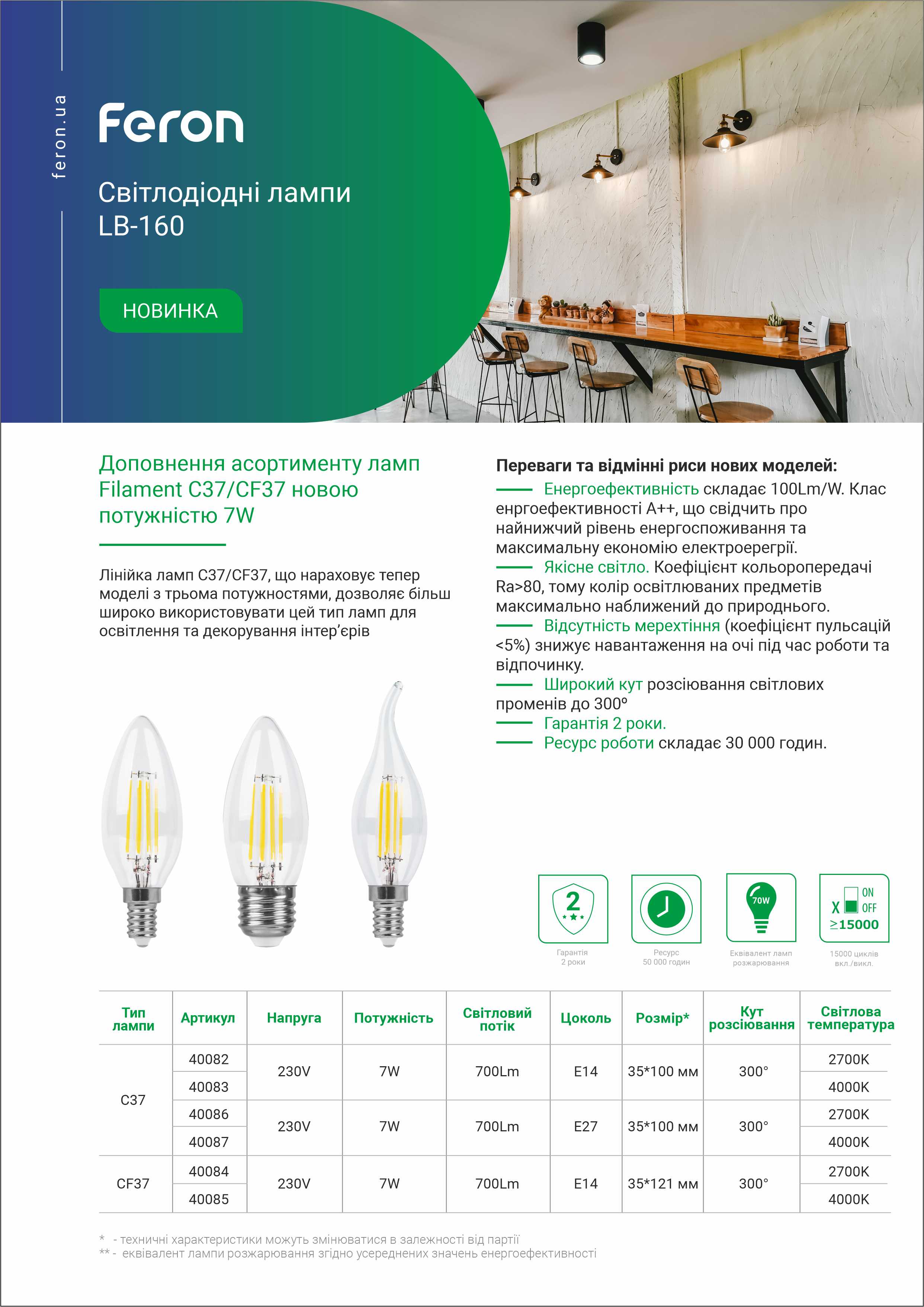 Лампа із серії світлодіодних ламп класичних форм з прозорими колбами, що якнайкраще поєнуються з класичними люстрами та бра. Лампи виготовляються за новітньою технологією світлодіодних ниток (LED Filament), що забезпечує їм високі показники енергоефективності 100Lm/W. Вона представляє собою тонку довгу підложку, на якій встановлені світлодіодні кристали дуже маленького розміру, вкриті шаром люмінофору. Завдяки такій технології та конструкції ламп, вони по зовнішньому вигляду та характеристикам свічення максимально близькі до ламп розжарювання. Адже саме лампи розжарювання створюють неповторну гру світла на гранях кристалів класичних люстр. Коефіцієнт кольоропередачі Rа>80, тому колір освітлювальних предметів максимально наближений до природнього.