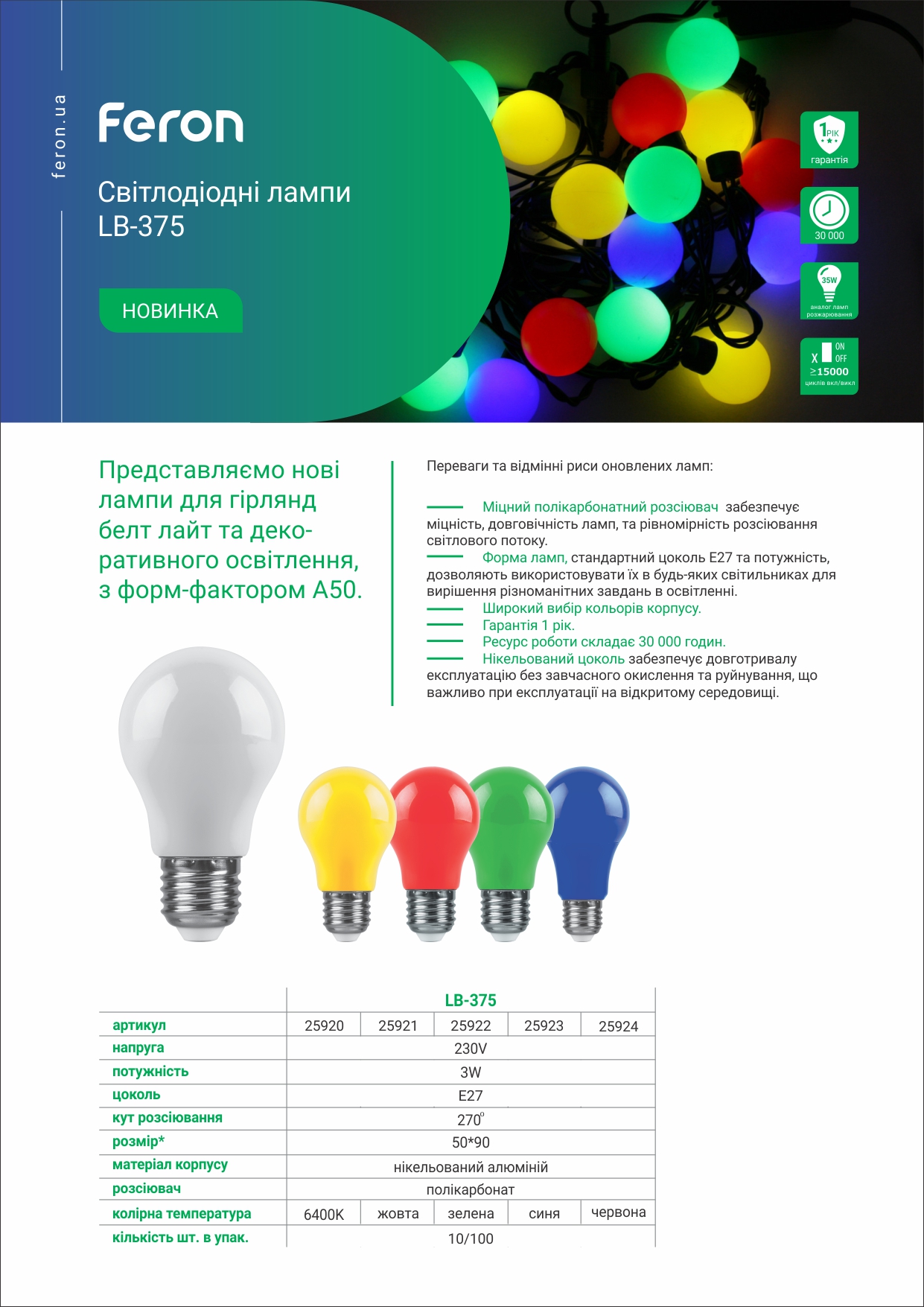 Також лампа має нікельований цоколь, який забезпечує довготривалу експлуатацію без завчасного окислення і руйнування. Ресурс роботи складає 30 000 годин.