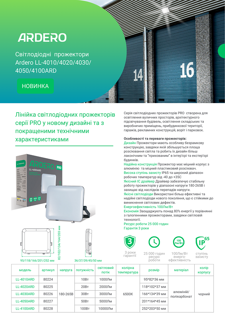 Світлодіодний прожектор Ardero LL-4030ARD PRO - це надійне та економічне рішення для освітлення зовнішніх територій, що поєднує в собі високу якість матеріалів та передові технології.