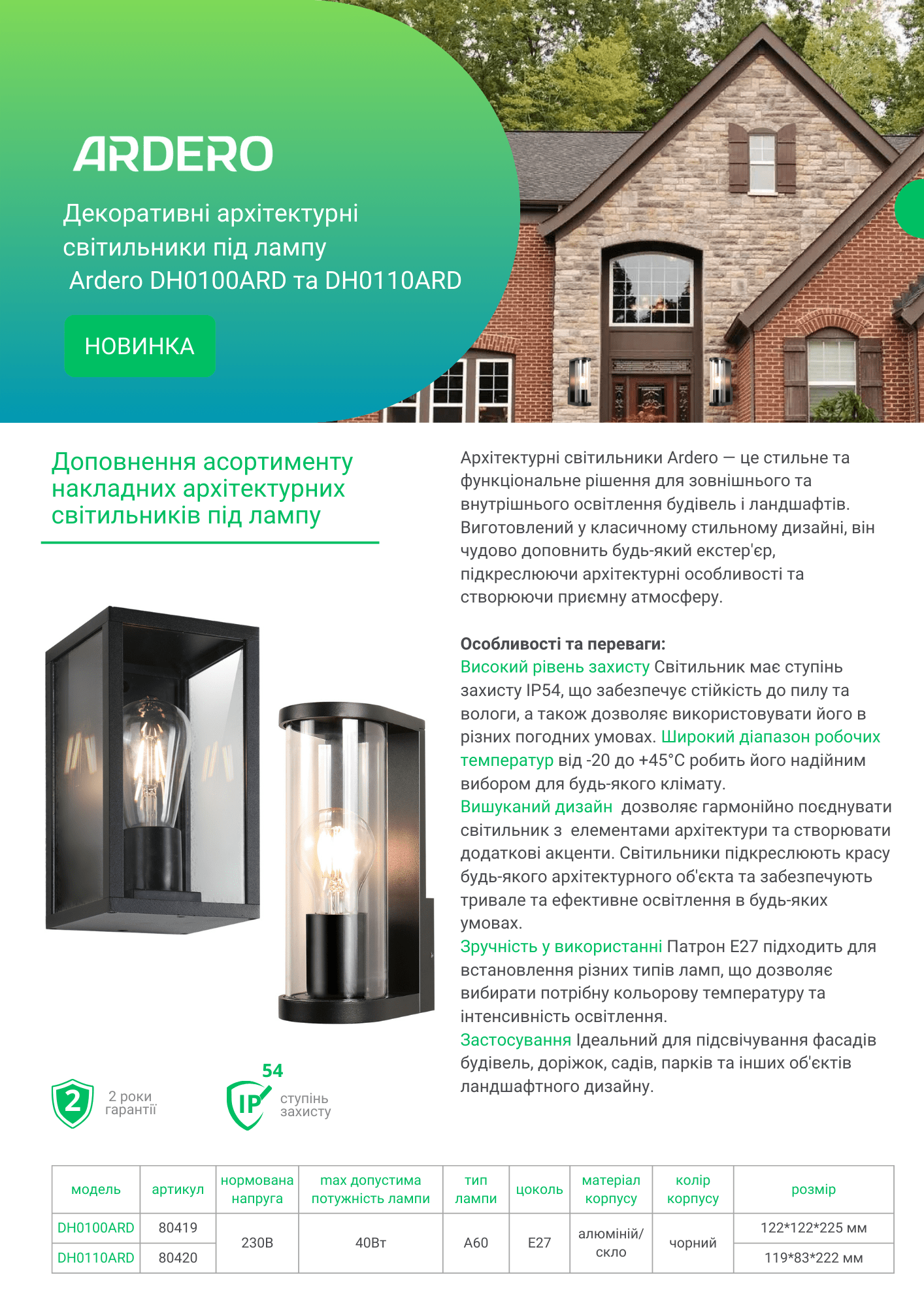Декоративні архітектурні світильники під лампу Ardero DH0110ARD