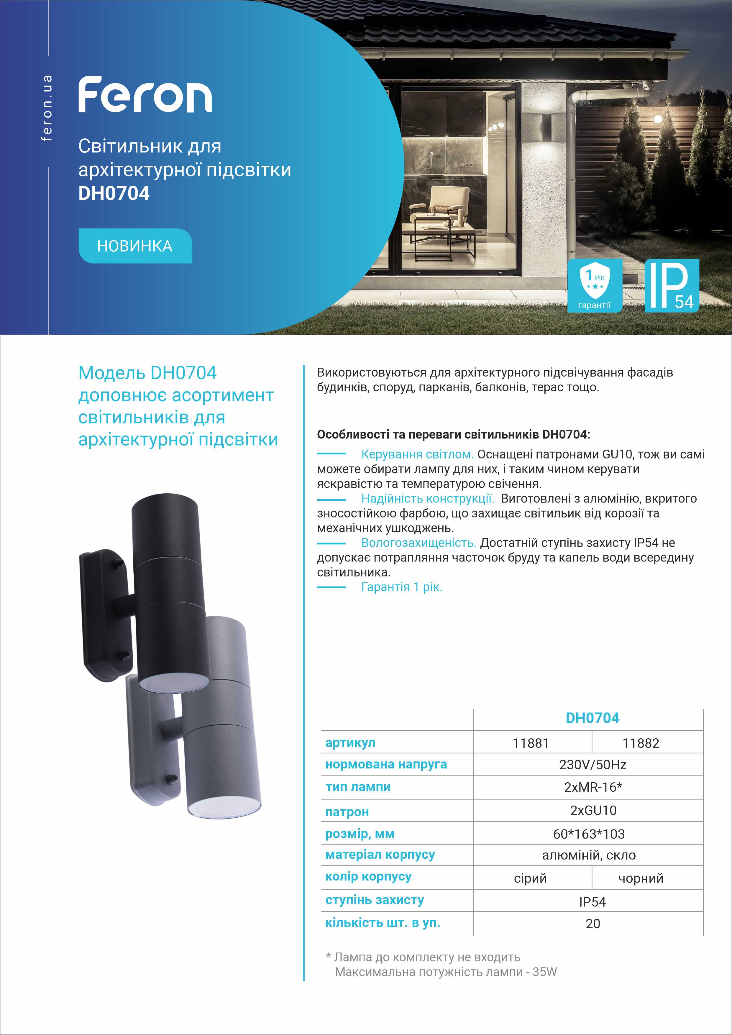 Архітектурний світильник Feron DH0704 — це естетичне, функціональне та надійне рішення для освітлення, що підкреслить красу будь-якого архітектурного об'єкта та забезпечить тривале та ефективне освітлення в будь-яких умовах.