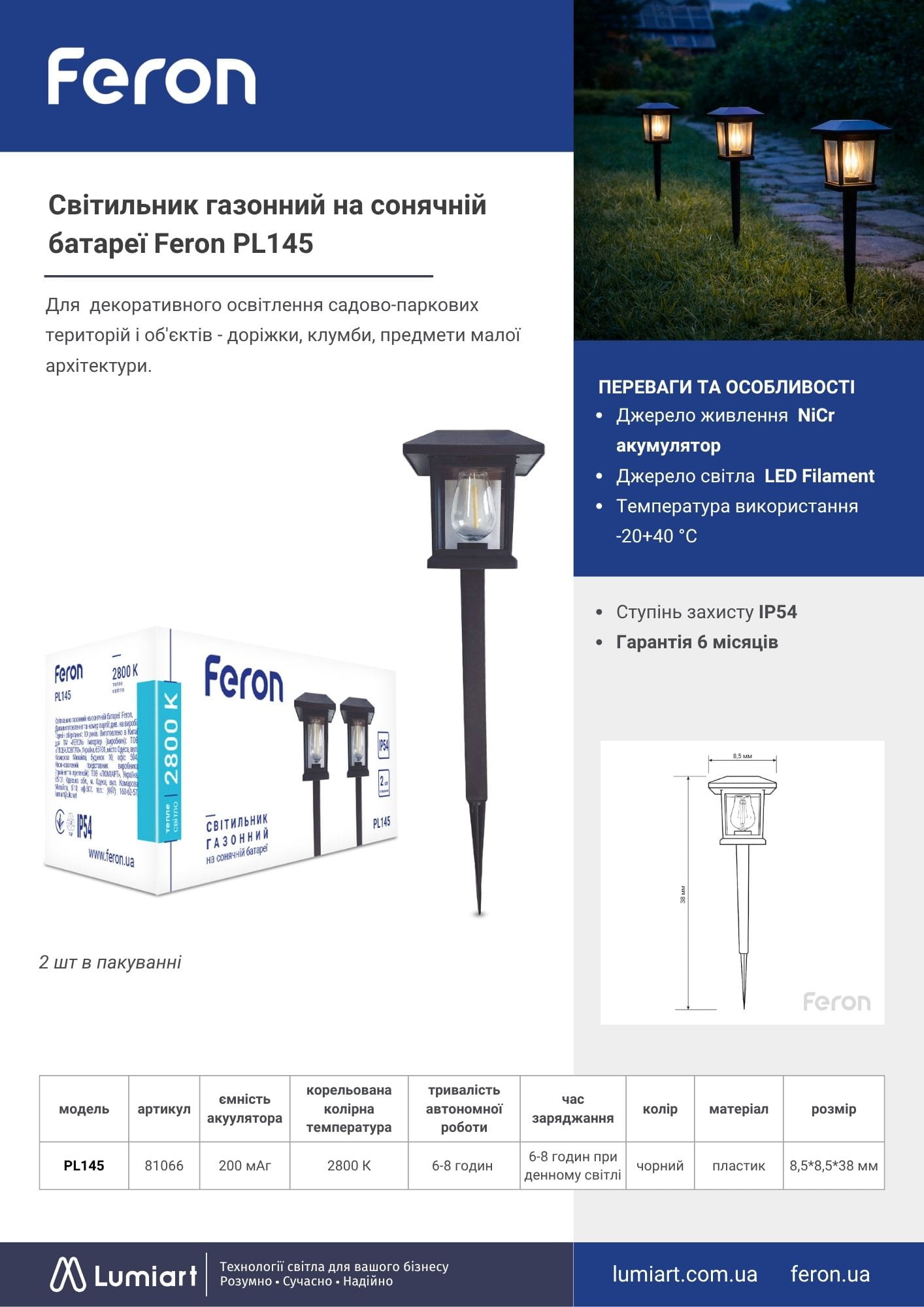 Обирайте газонний світильник на сонячній батареї Feron PL145, якщо вам потрібне стильне, автономне та енергоефективне LED освітлення для саду та двору.