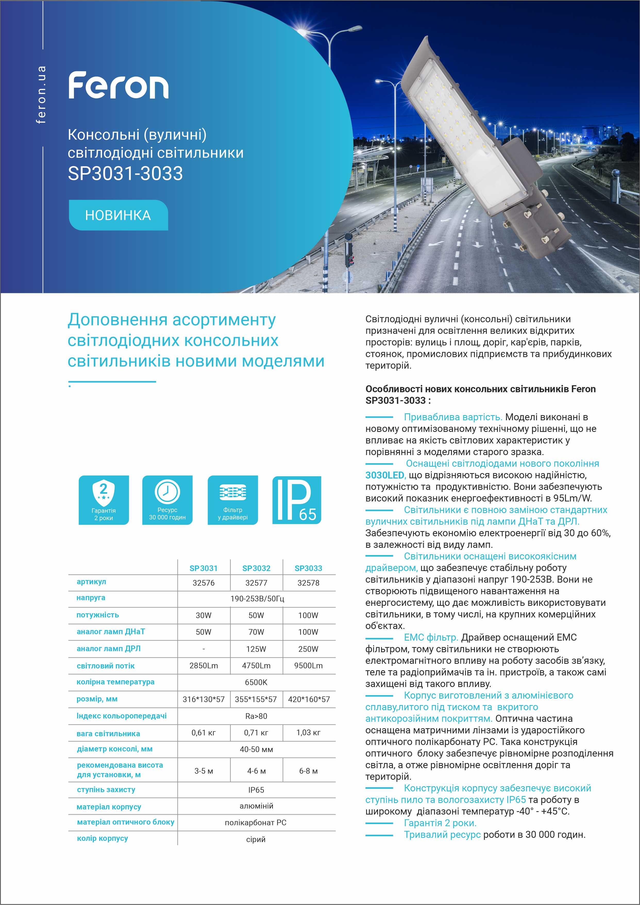 Feron SP3033 — це ідеальне поєднання сучасного дизайну та високої функціональності для забезпечення безпеки і комфорту вуличного освітлення.