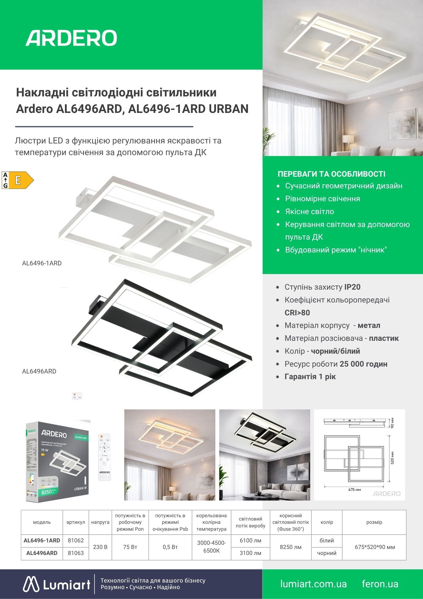 Шукаєте сучасну LED люстру з пультом, яка поєднує стильний дизайн і функціональність? Накладні світлодіодні світильники Ardero URBAN AL6496ARD та AL6496-1ARD — це ідеальне рішення для освітлення квартири, будинку, офісу або комерційного простору.